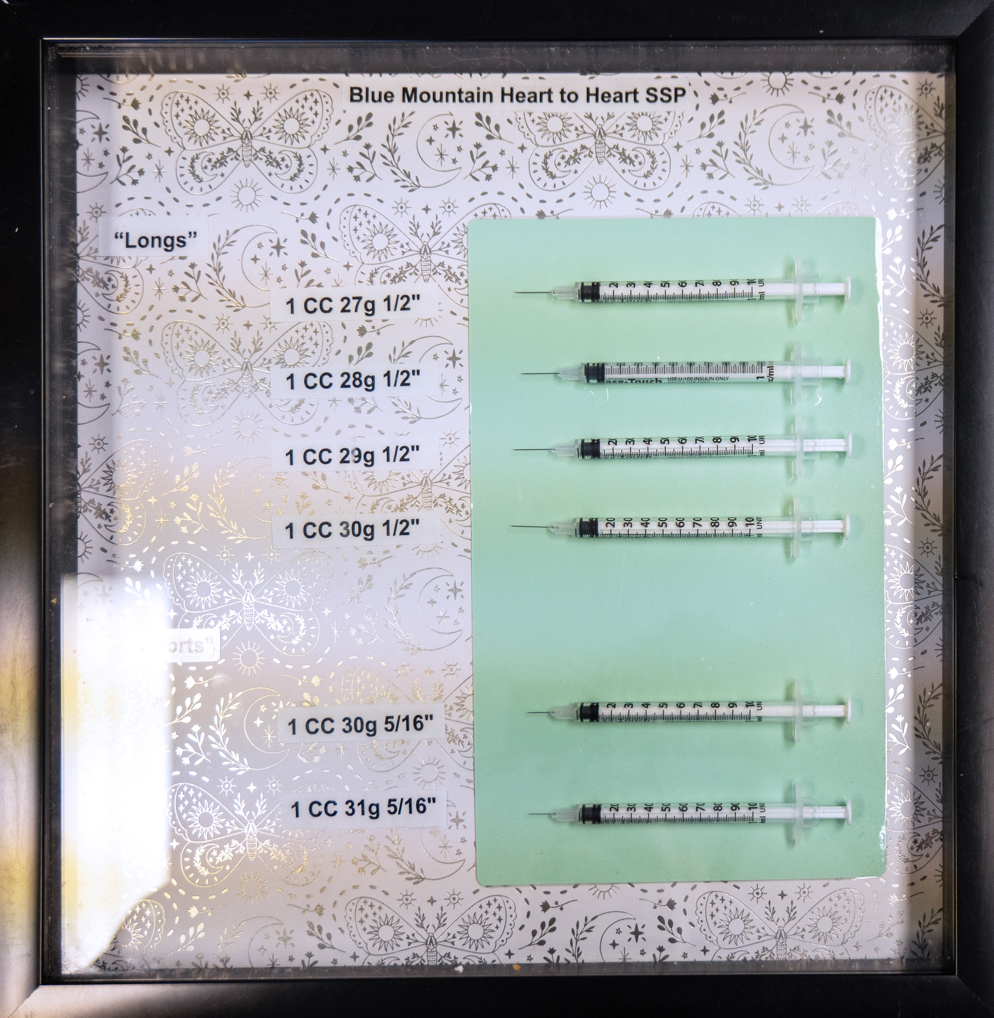 A shadowbox frame showing different sizes and gauges of syringes: “Longs” with 4 1-cc needles in 27, 28, 29, and 30 gauge and “Shorts” with 2 1-cc needles in 30 and 31 gauge. At the top of the chart is the name of the organization: Blue Mountain Heart to Heart SSP (syringe services program).