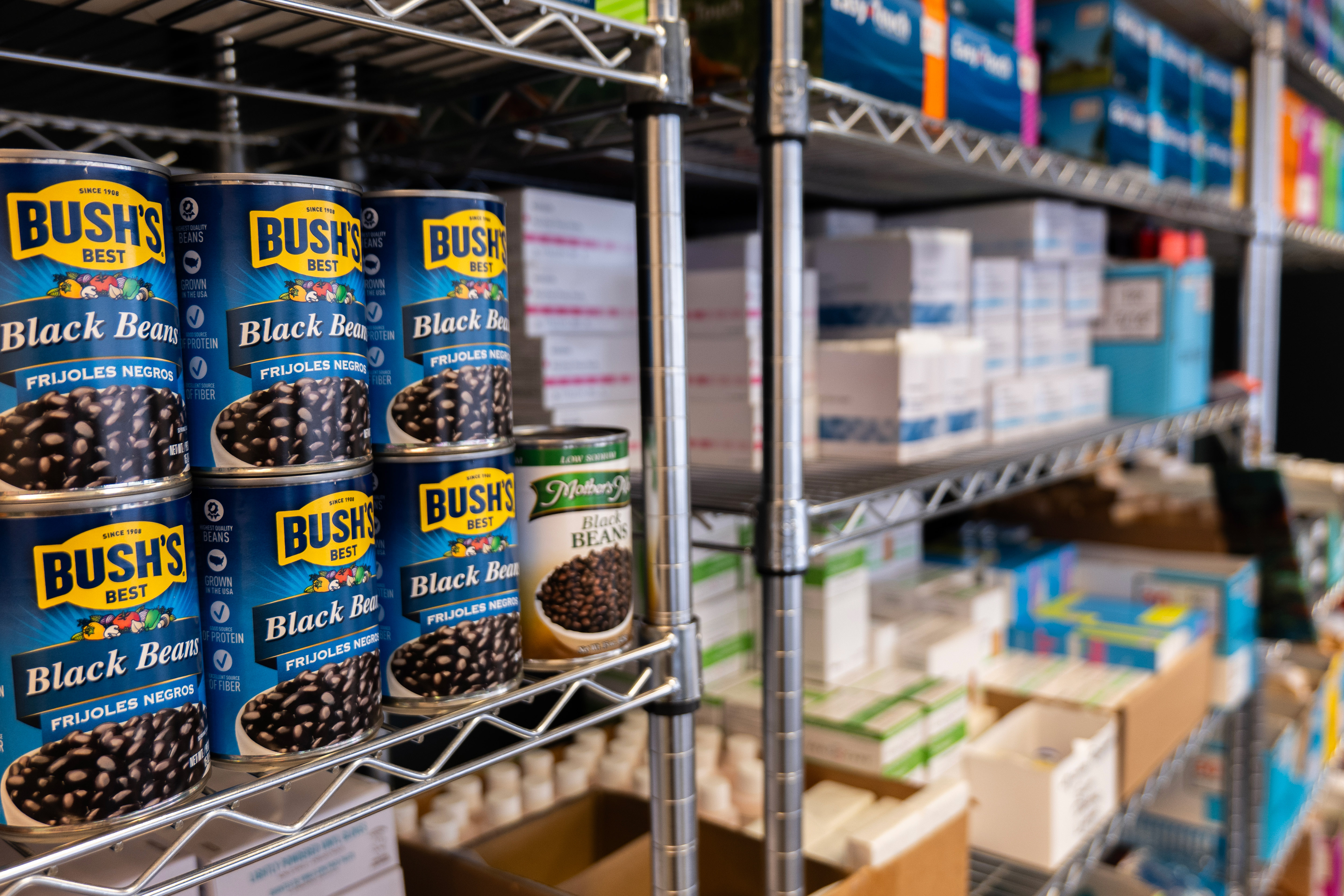 Close-up, angled photo of supply shelves in a syringe services program (SSP) that show many colorful boxes of syringes and other materials out of focus. In focus on the left side of the image is a stack of black beans, showing that SSPs also engage in other social services, like distribution of food).