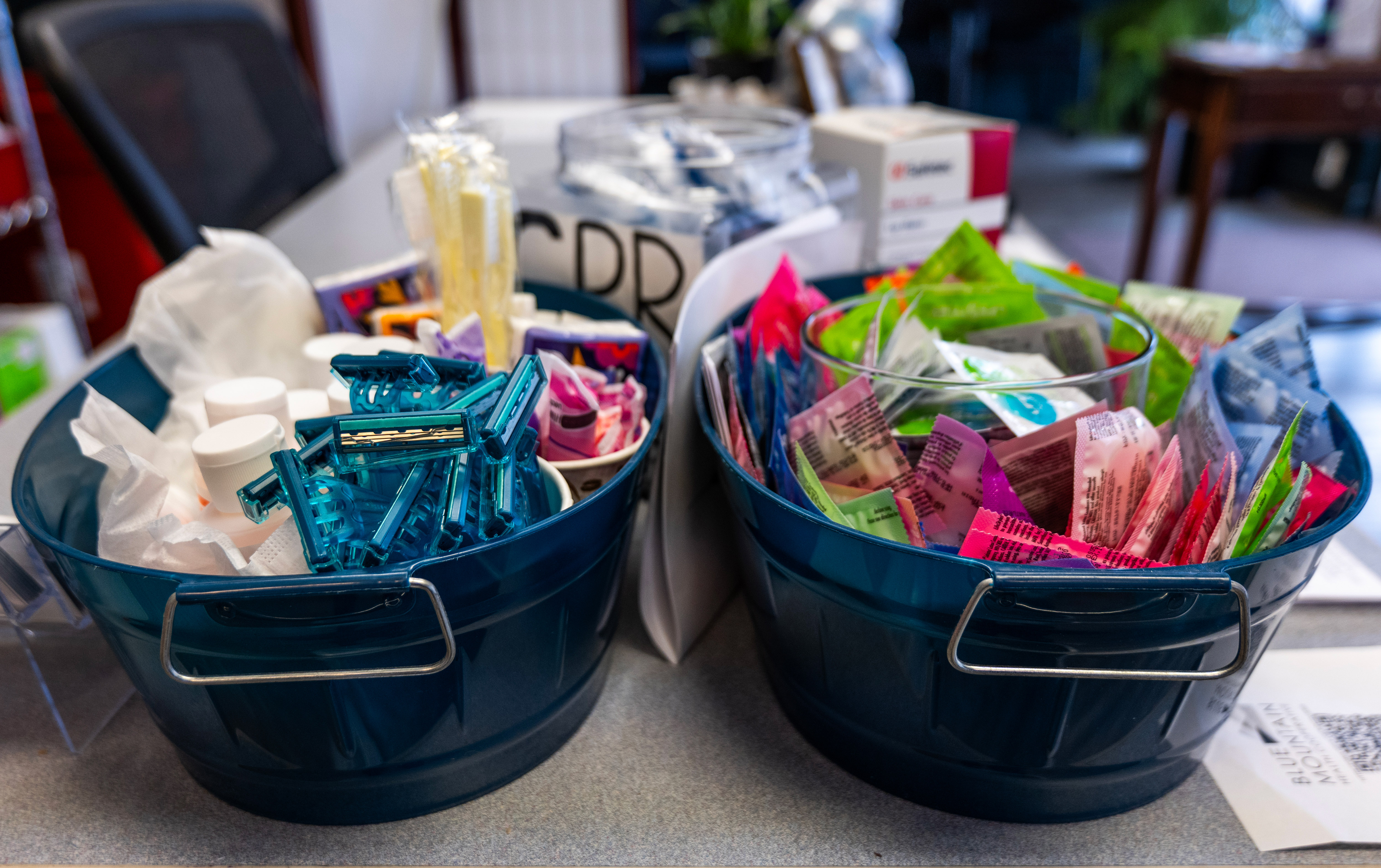 Close-up of two large blue metal bins on a table in a syringe services program. The bin on the left contains hygiene supplies like razors, tissue, and individually wrapped toothbrushes. The bin on the right appears to contain a range of condoms and other items in different colors and sizes.