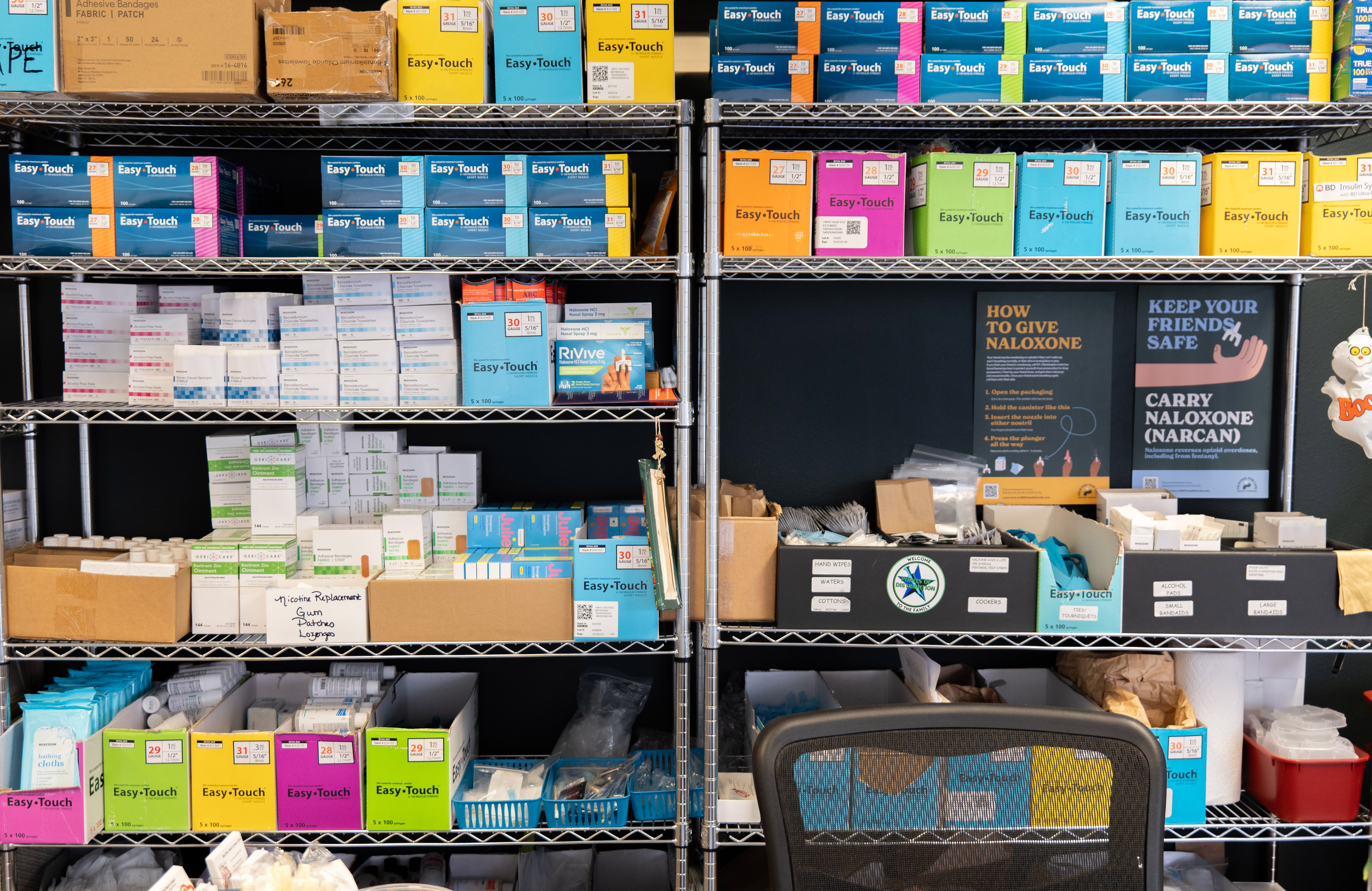 Close-up of supply shelves in a syringe services program showing colorful boxes of syringes in different sizes; boxes of nicotine replacement gum, patches, and lozenges; boxes of nasal-spray naloxone, hygiene supplies like bathing cloths, and a range of other materials that are unidentified. There are two posters visible between the shelves – one reads “How to give naloxone,” the other “Keep your friends safe – Carry naloxone (Narcan).”