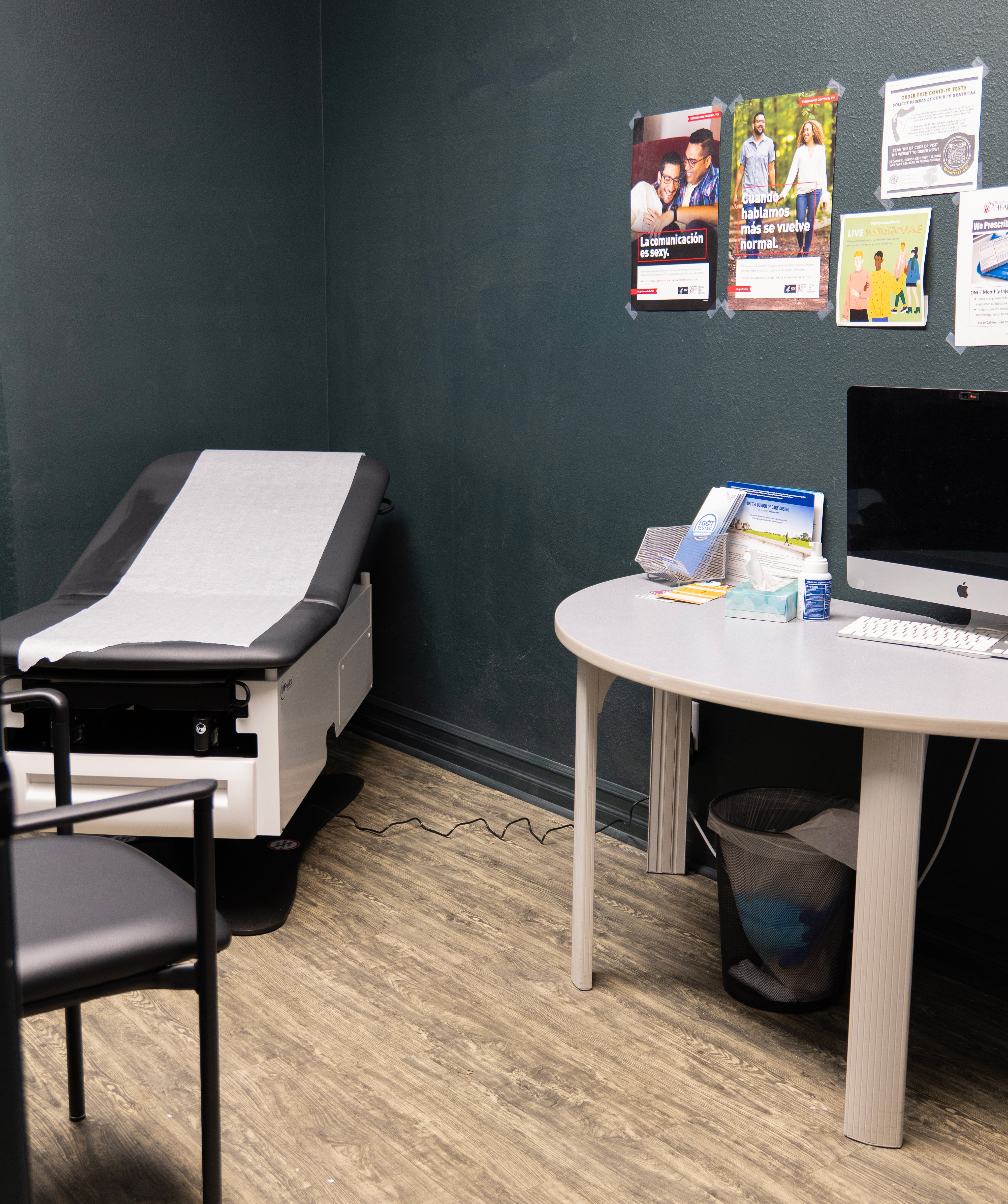 Interior of an exam room in a community health care clinic and syringe services program showing a chair and a table with a computer, educational posters on the wall, and a patient clinical exam bed with a paper cover.