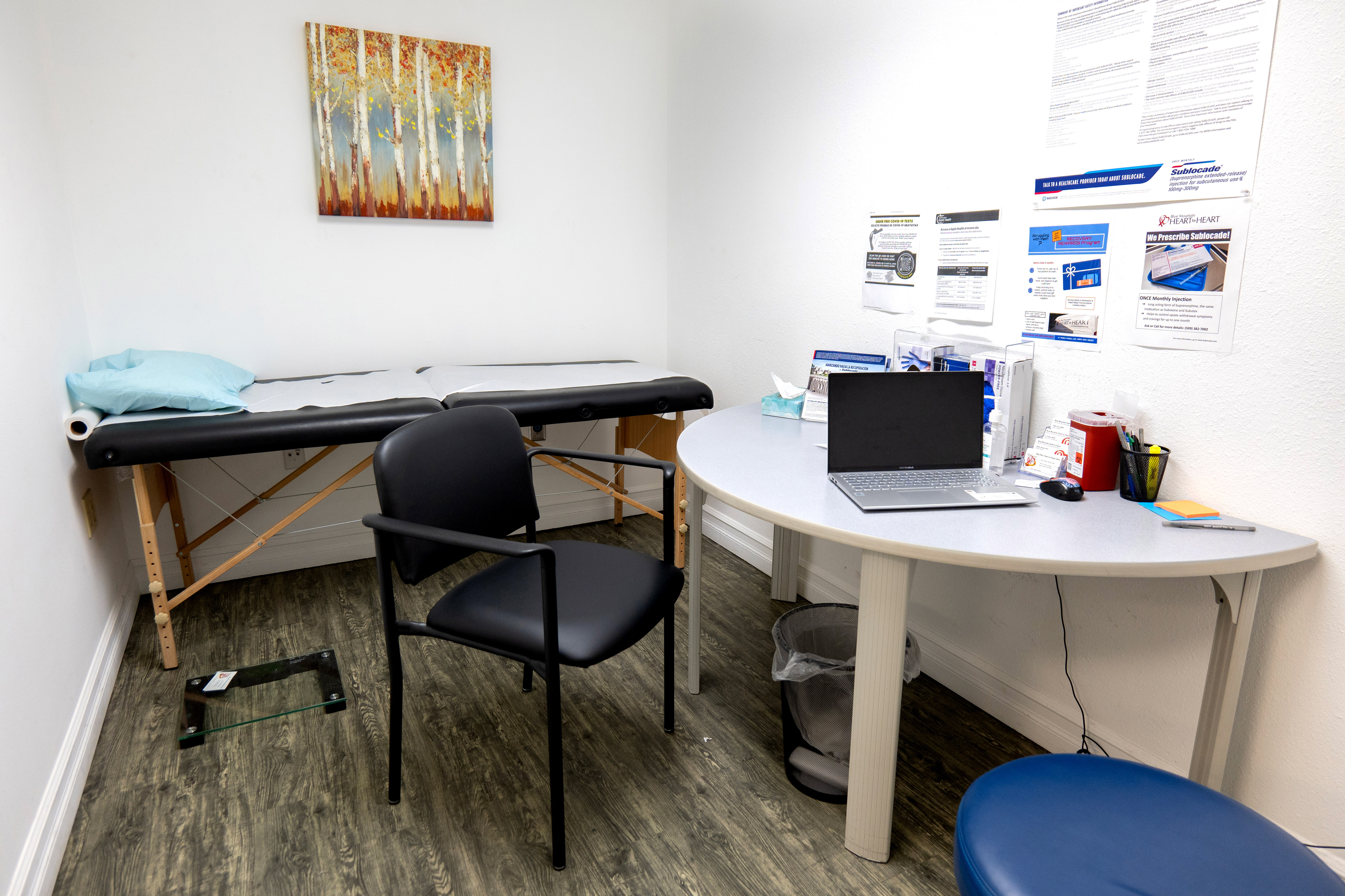 Interior of an exam room in a community health care clinic and syringe services program showing a chair and a table with a computer, educational posters on the wall, and folding cot used as a patient clinical exam bed with a paper cover and a pillow