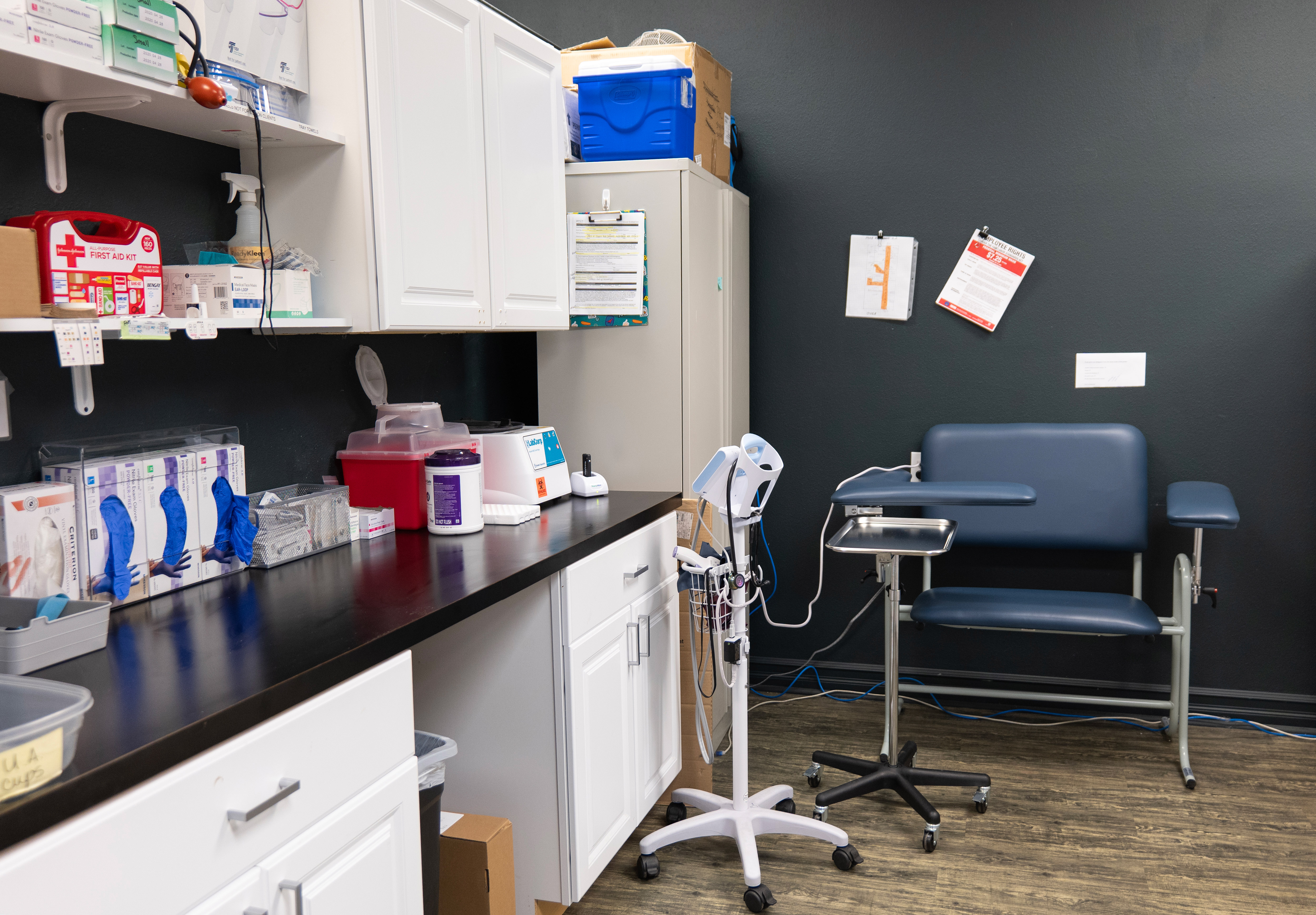 Area in a community health care clinic and syringe services program where patient care is provided. The space features a long counter with cabinets and shelves stocked with gloves, a first aid kit, a sharps container, and equipment. Next to the counter is a blue phlebotomy chair with one arm rest that extends forward then bends at a 90-degree angle across the front of the chair (for resting an arm on when having blood pressure checked or blood drawn). A blood pressure cuff and machine on a rolling stand is next to the chair.