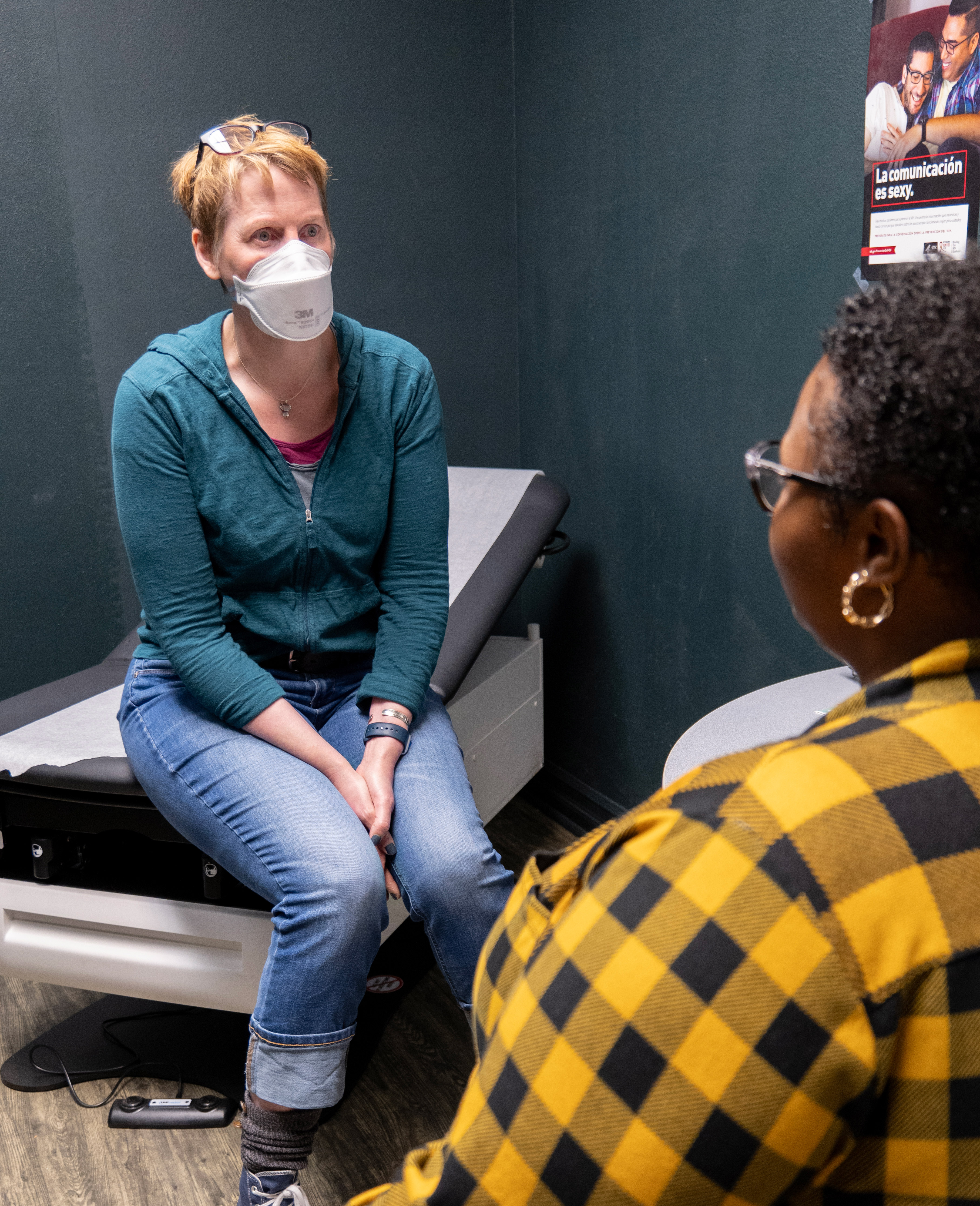 A white client/patient with short hair wearing a white N95 respirator/mask sitting on a patient clinical exam bed with their hands clasped and tucked between their knees listening while a Black provider with short hair and a black and yellow shirt sits across from them and talks.