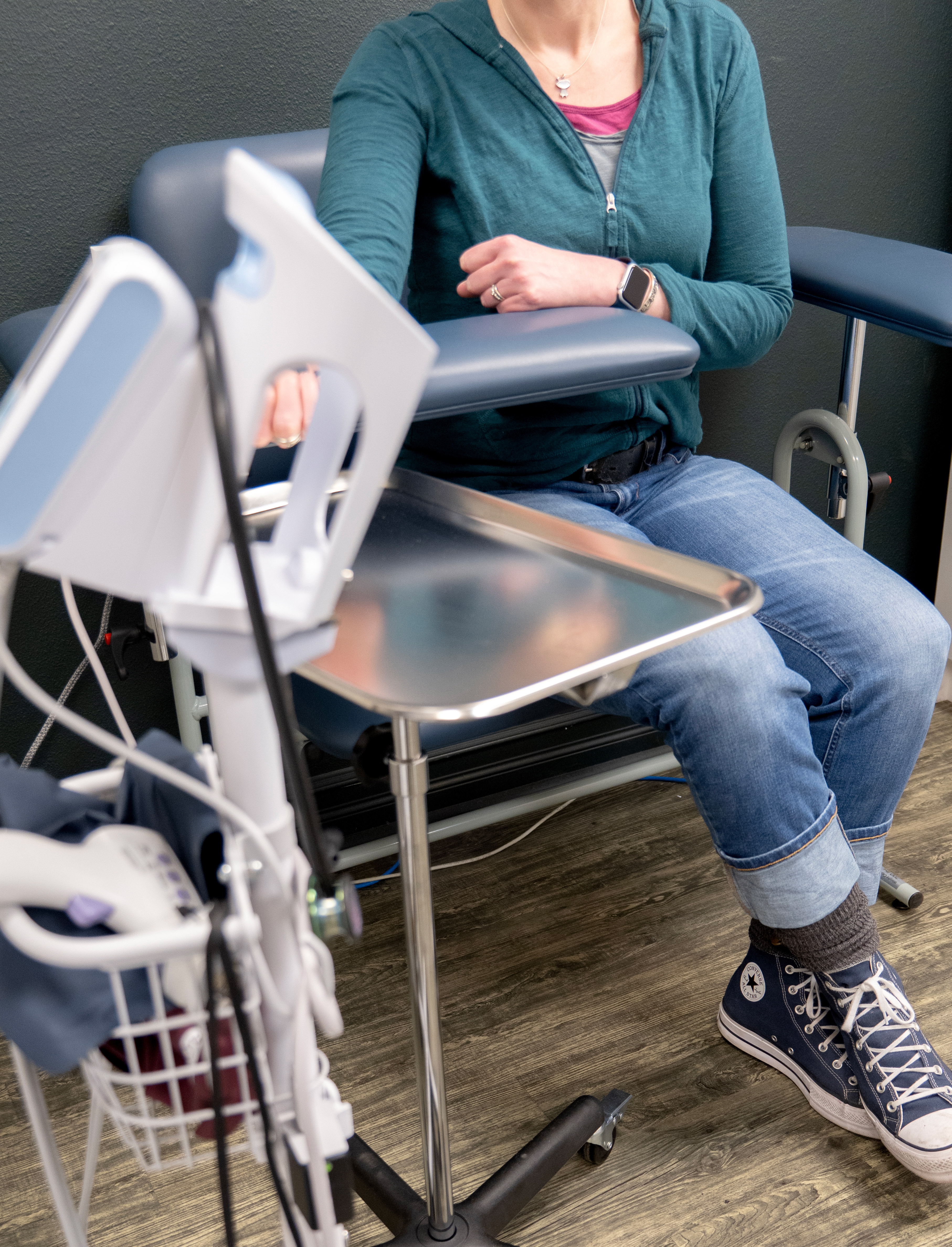 A white client/patient photographed from the neck down sitting in a blue phlebotomy chair with their ankles crossed and one arm extended on the arm of the chair (about to have their blood pressure taken). A white blood pressure machine is in the foreground.