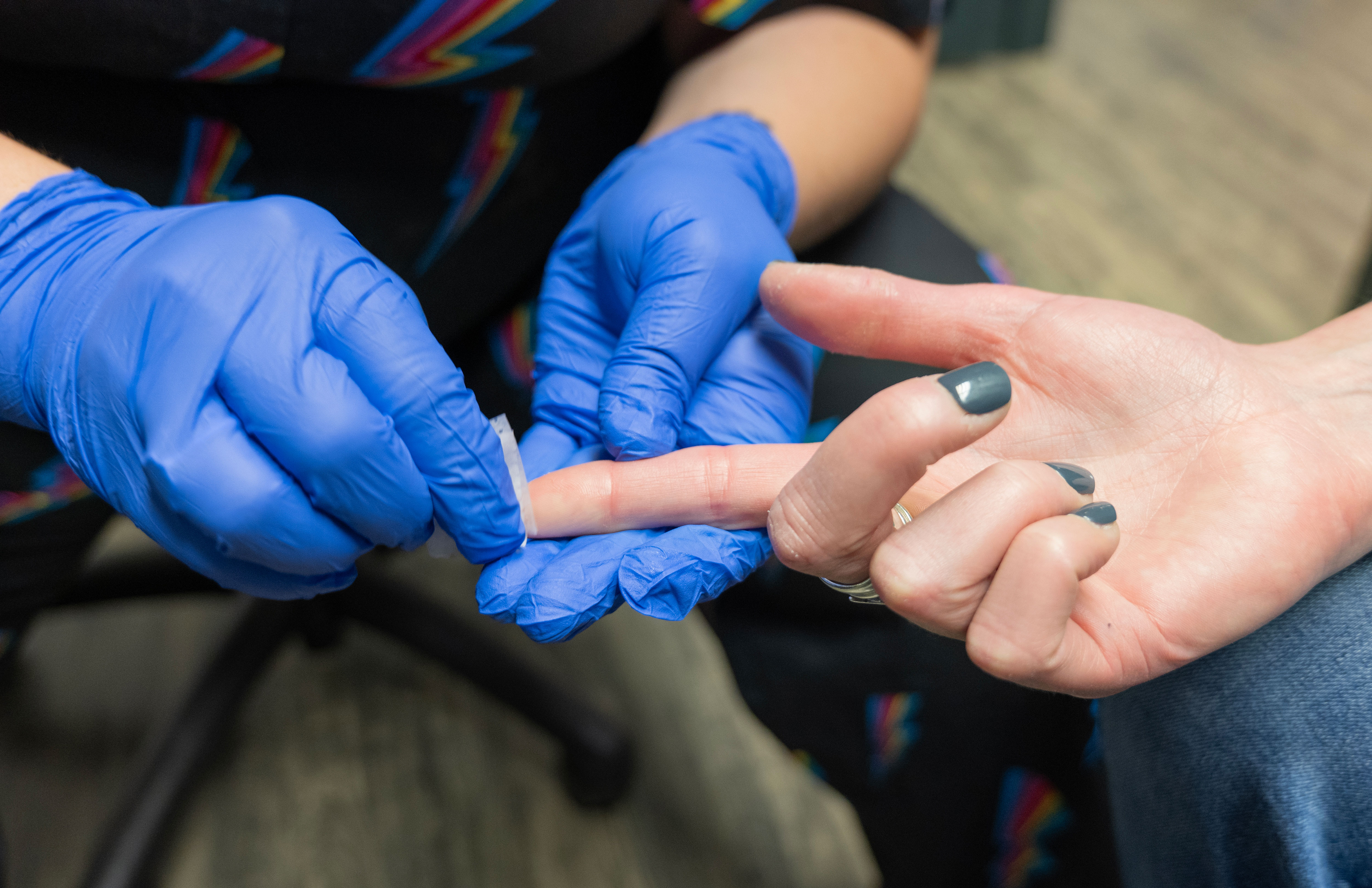 Close up of a white client/patient’s hand, index finger extended across the fingers of a gloved provider’s hand. The provider is disinfecting the tip of the patient/client’s index finger with an alcohol wipe, preparing to do a finger stick for a blood test, such as a rapid HIV or Hepatitis C Virus test.