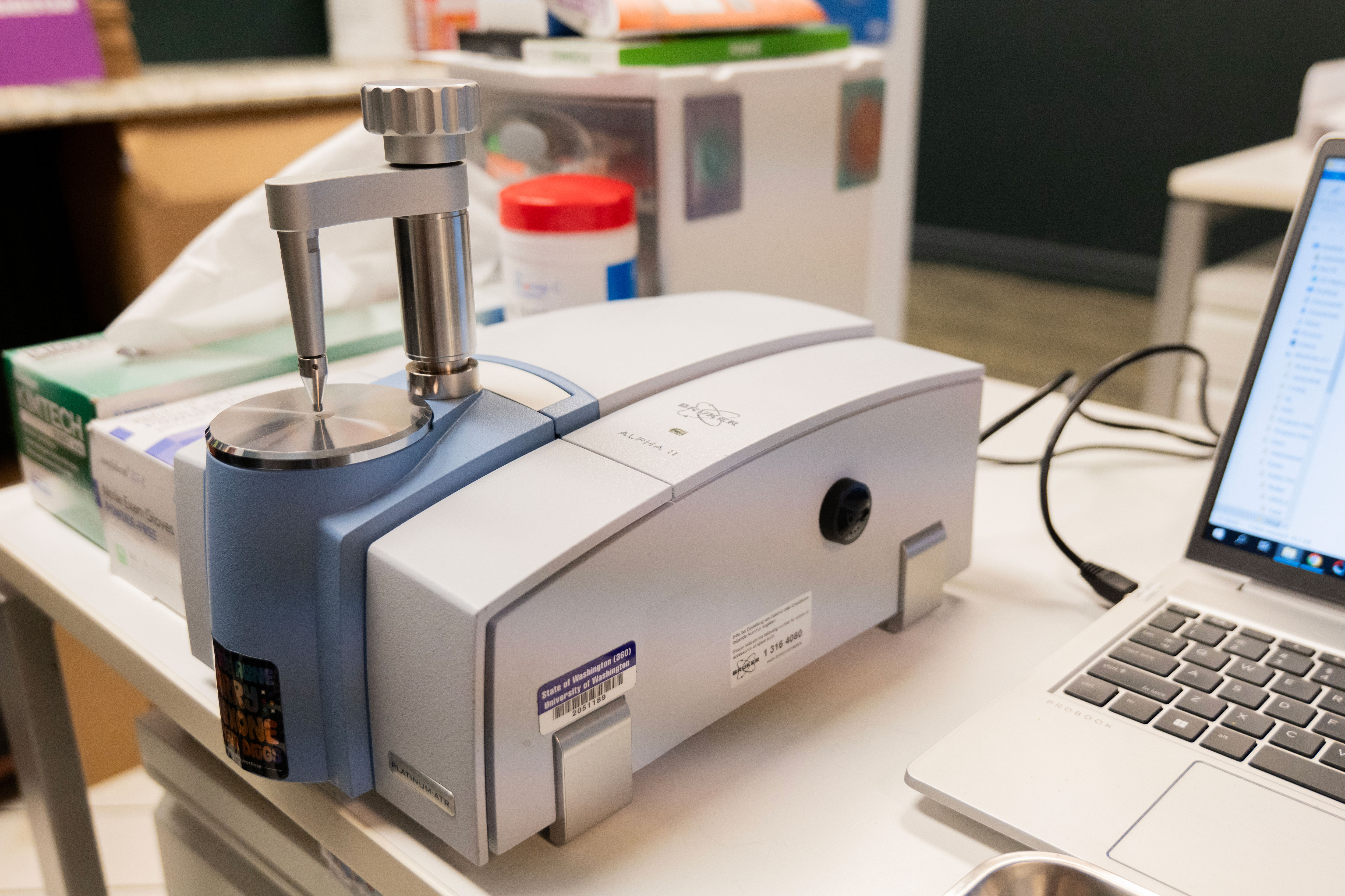 A compact FT-IR spectrometer used for drug checking (testing small quantities of substances to see what drugs or other chemicals are in them), photographed from the front at an angle. Visible in the corner of the image is a laptop.