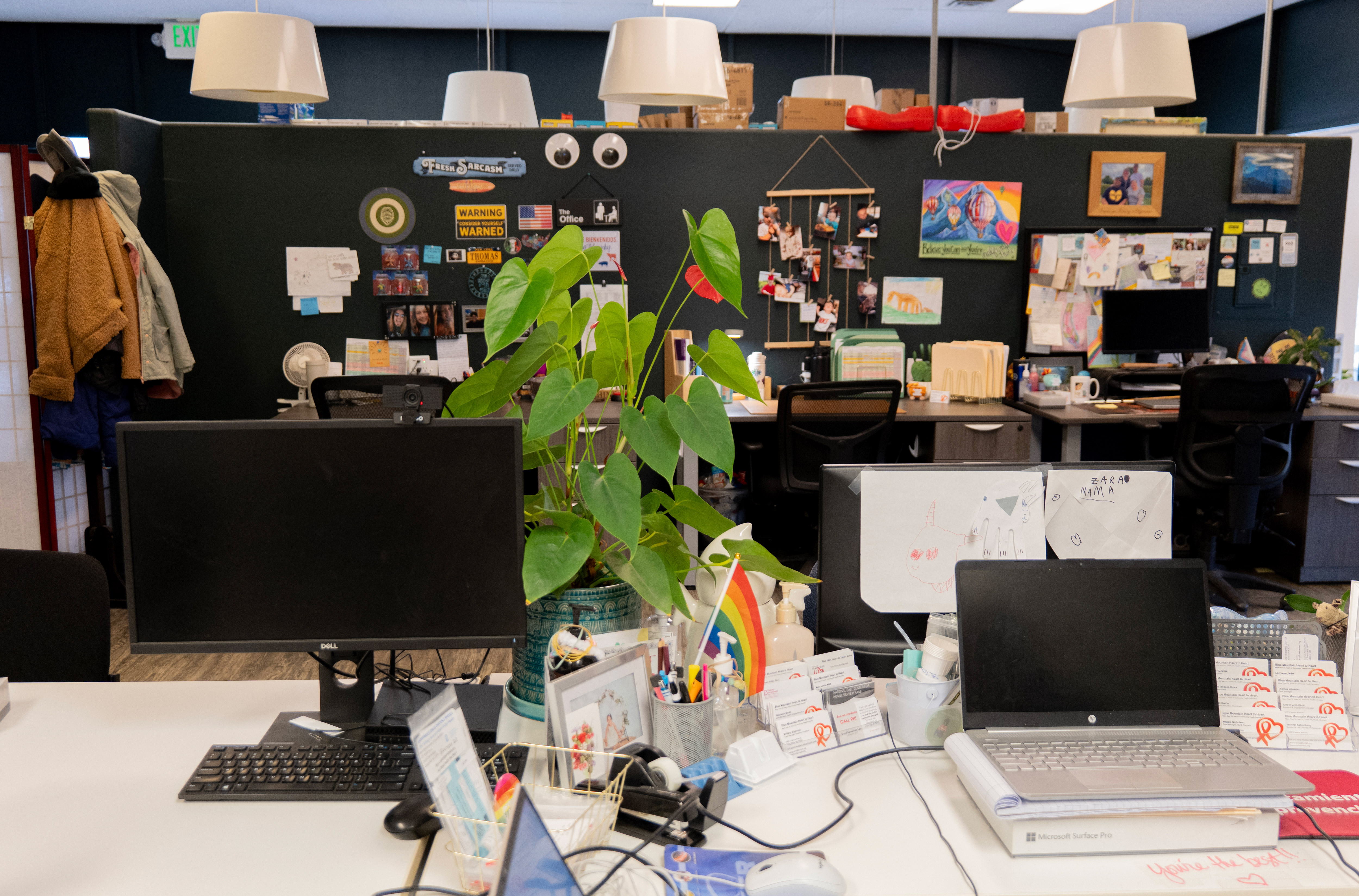 Interior of a syringe services program and community health organization showing multiple desks and workspaces for staff, decorated with colorful artwork and plants, creating a warm and inviting atmosphere.