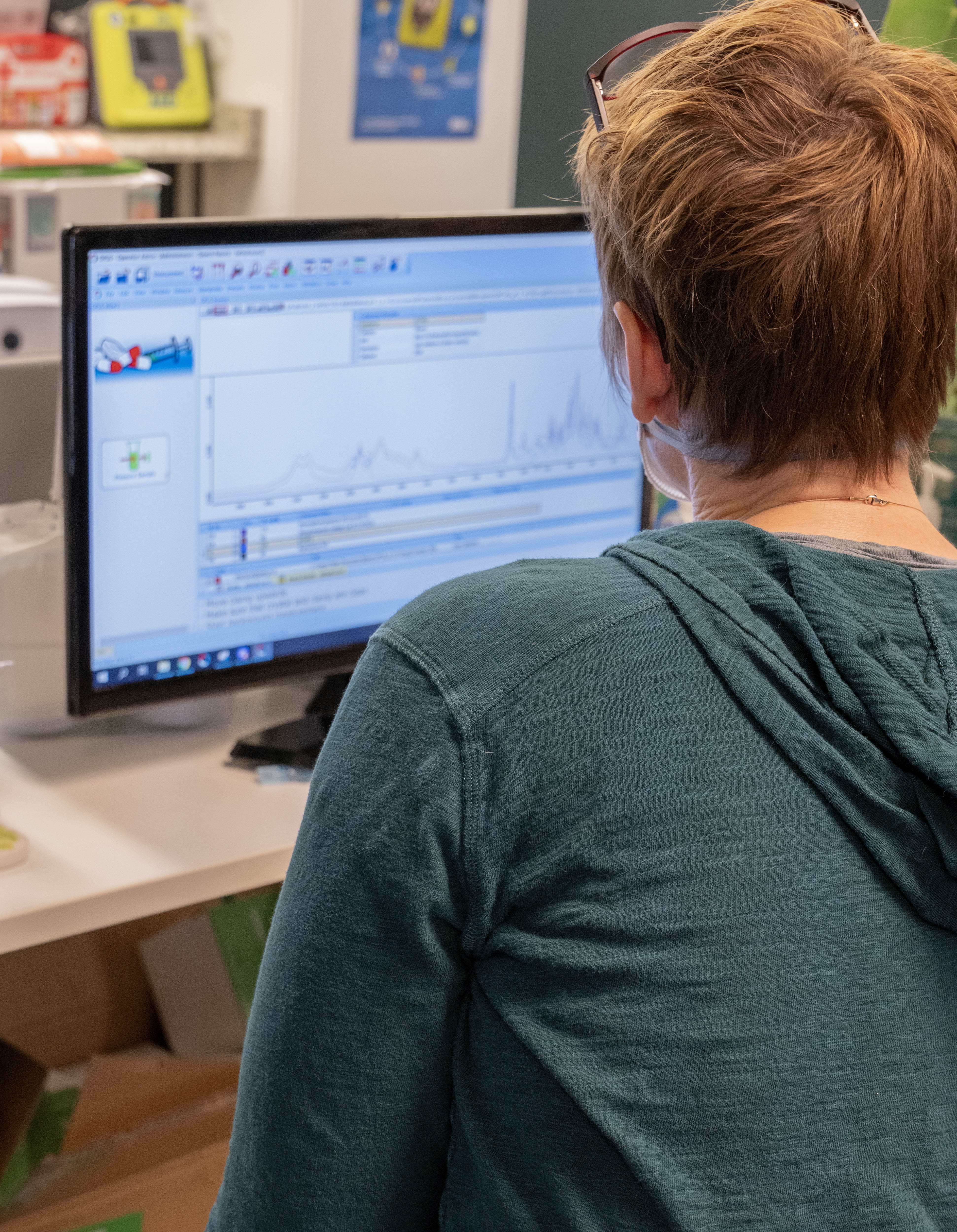 Patient/client with short hair and green hoodie shot from behind with camera looking over their shoulder at a computer monitor showing their drug sample results.