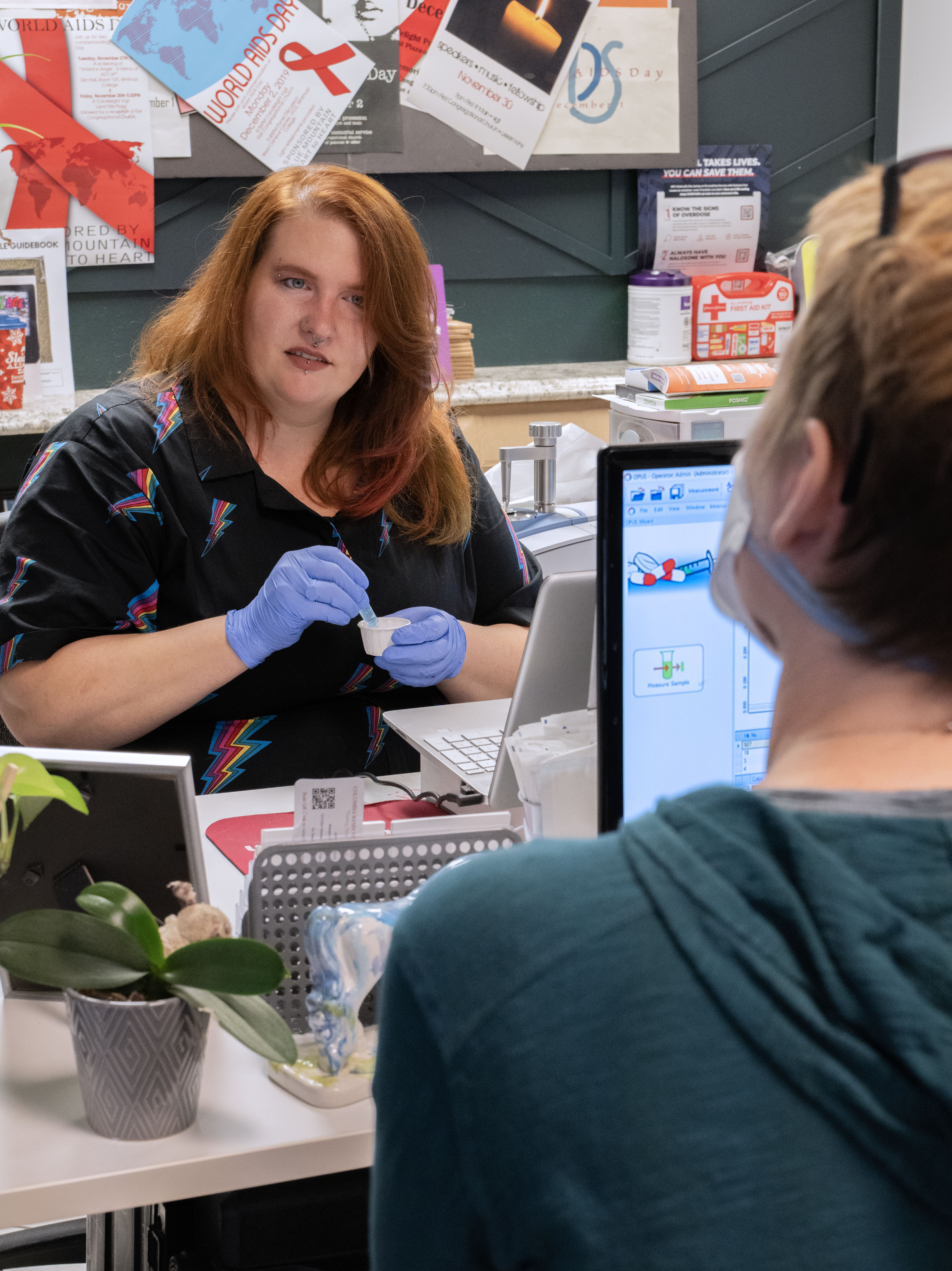Drug checking technician with long red hair and blue latex gloves mixing a drug sample in a small white cup while talking to a client/patient sitting across a desk from them. The client has short hair and is wearing an N95 respirator/mask. A computer screen showing the results of the drug sample analysis is between them.