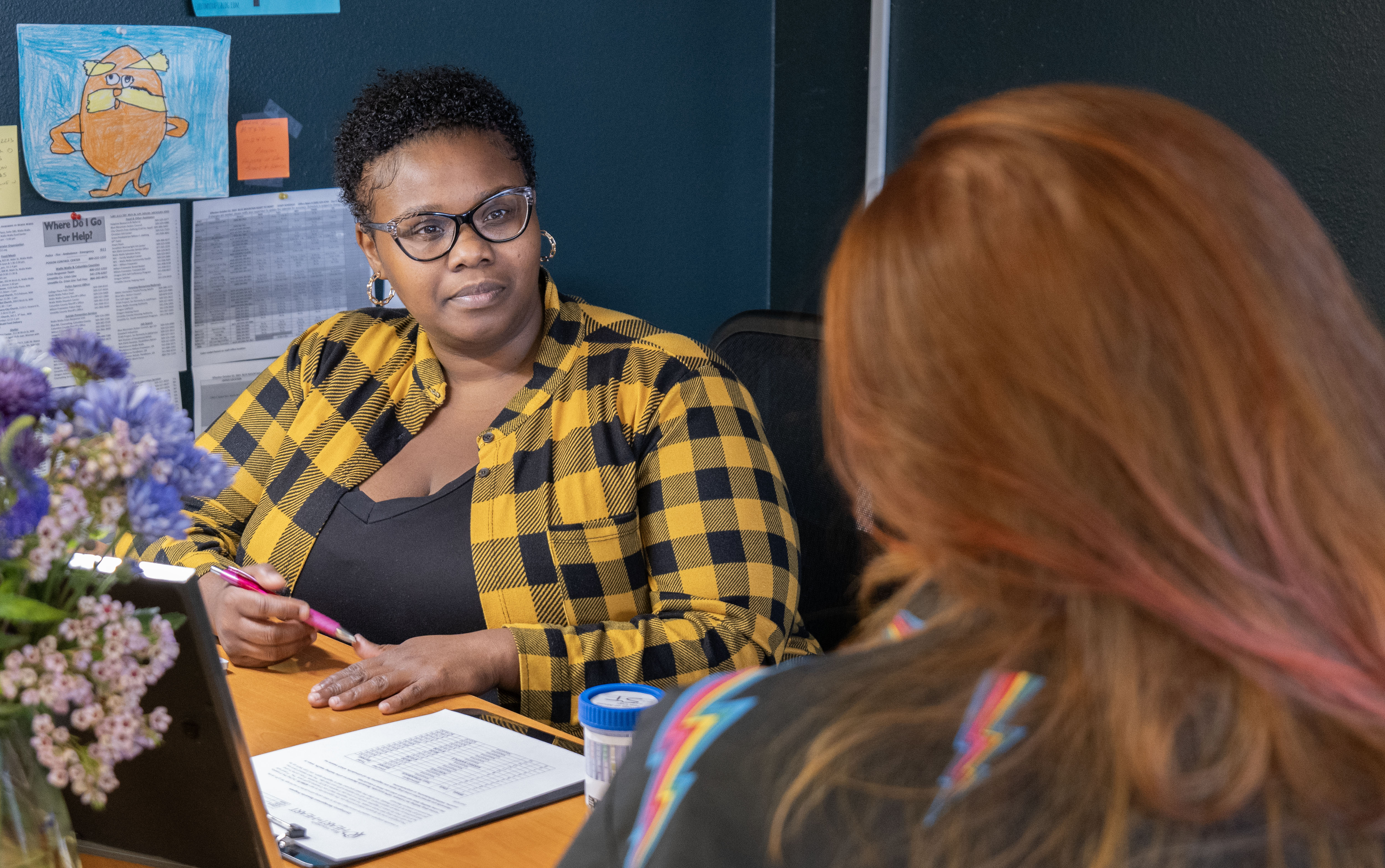 A community health care or drug treatment provider sitting at a desk listens to a client with long red hair seated next to them. A container for a urine drug screen sits on the desk between them, along with some paperwork. This interaction was specifically related to contingency management procedures but could also be used for any other type of counseling or treatment intervention services.