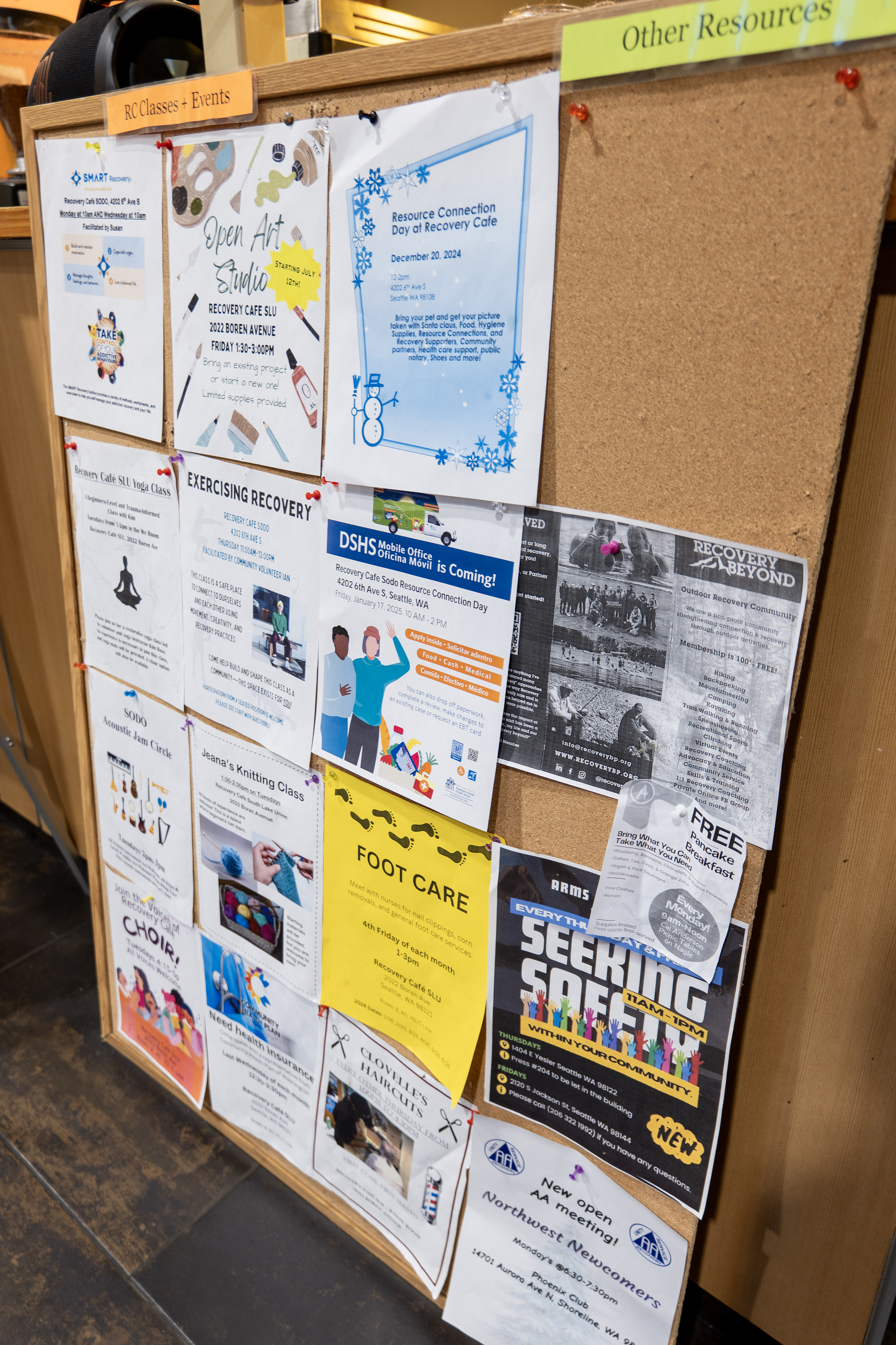 A bulletin board in a recovery support organization with flyers posted about different activities and services, including foot care, an exercise class, an AA / 12-step meeting, and more.