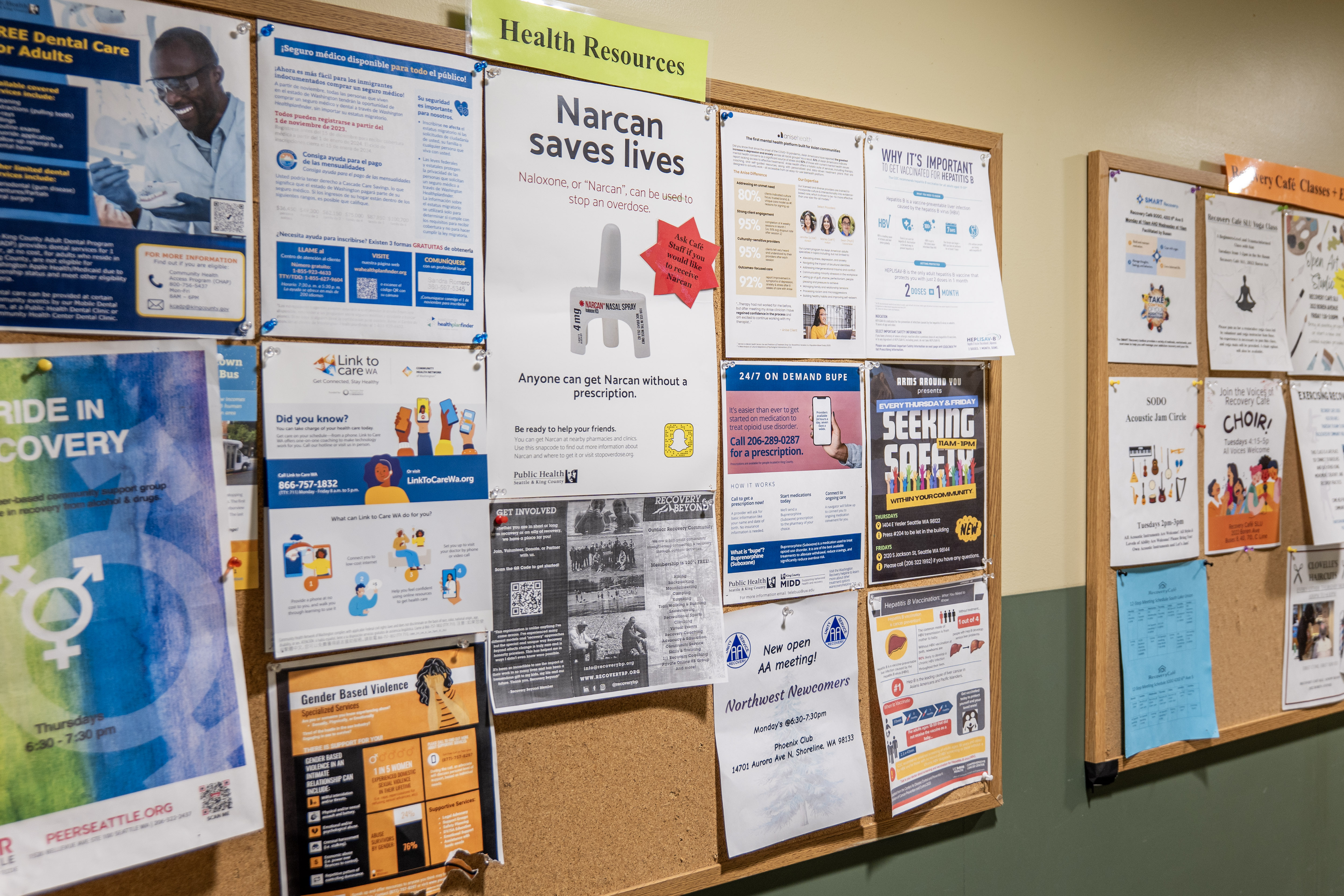 Bulletin boards on the wall of a recovery support organization with health resources and classes and events