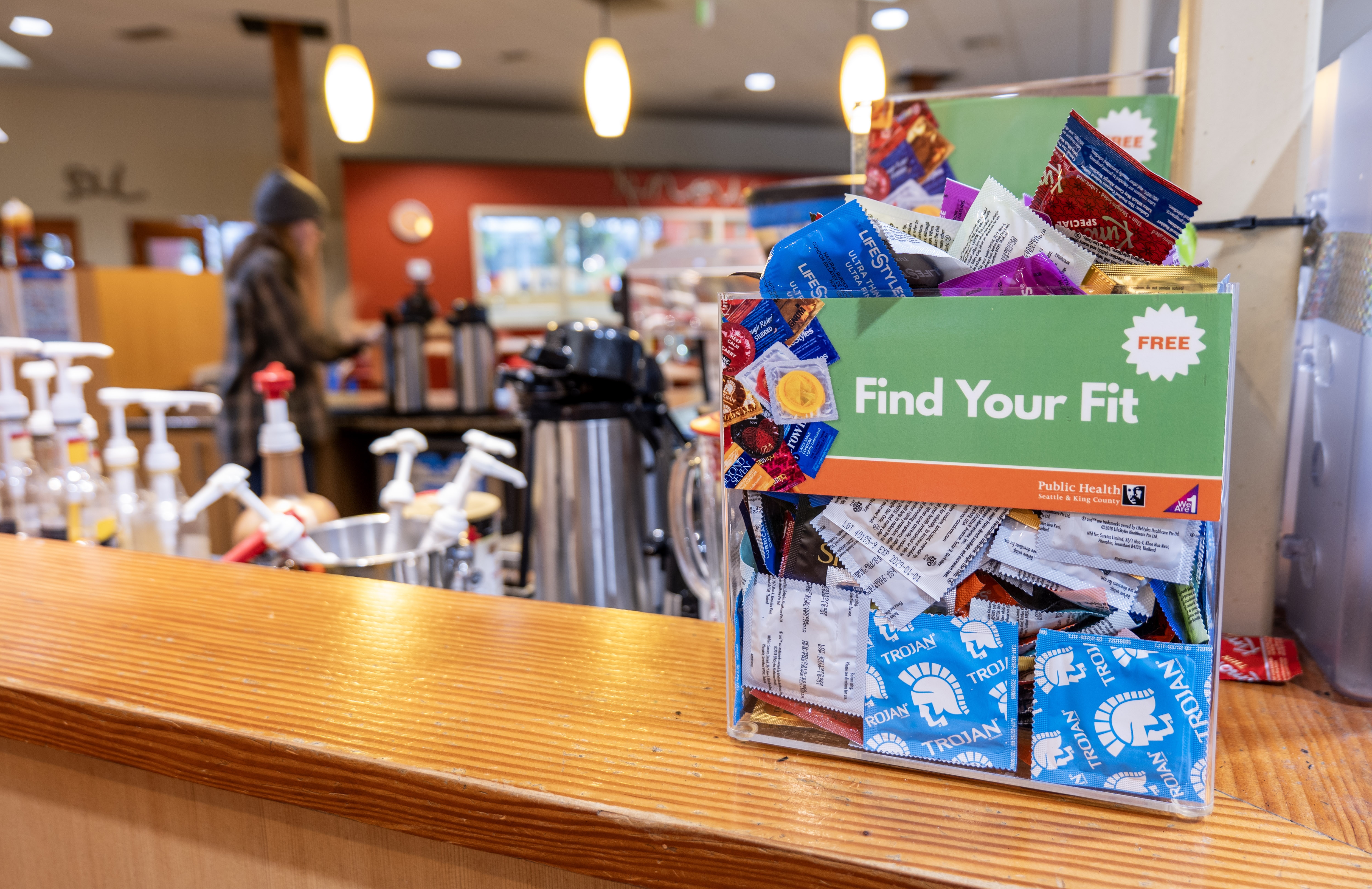 Cafe area and counter in a recovery support organization with different flavor syrups behind the counter, a barista in the back, and in the foreground on the counter, a bin of free condoms with a sign that reads “Find Your Fit.”
