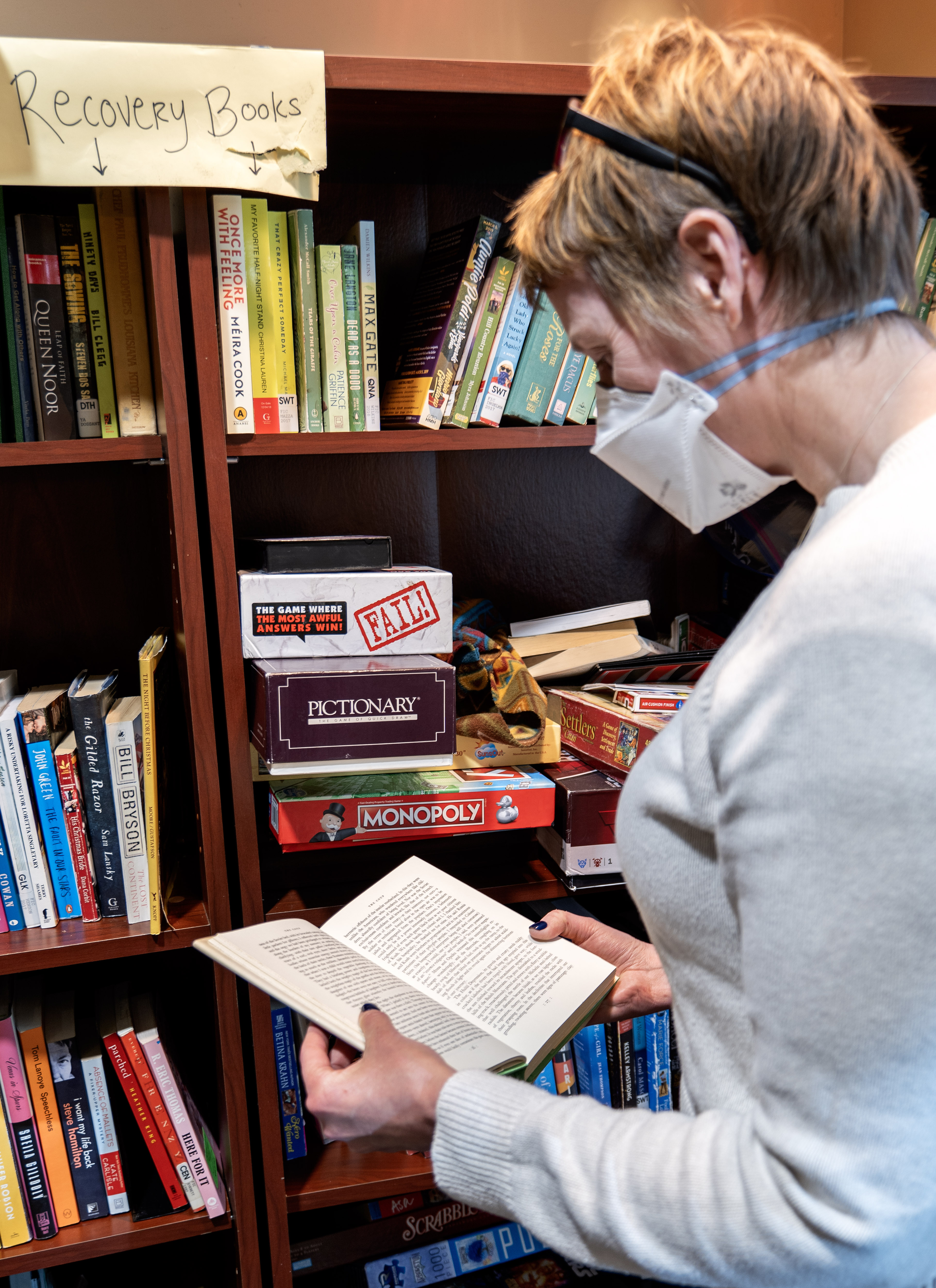 A person with short hair wearing an N95 mask and standing in front of some bookshelves at a recovery support organization reading a book. A sign on the shelves reads, “Recovery Books;” there are also games stacked on one side.