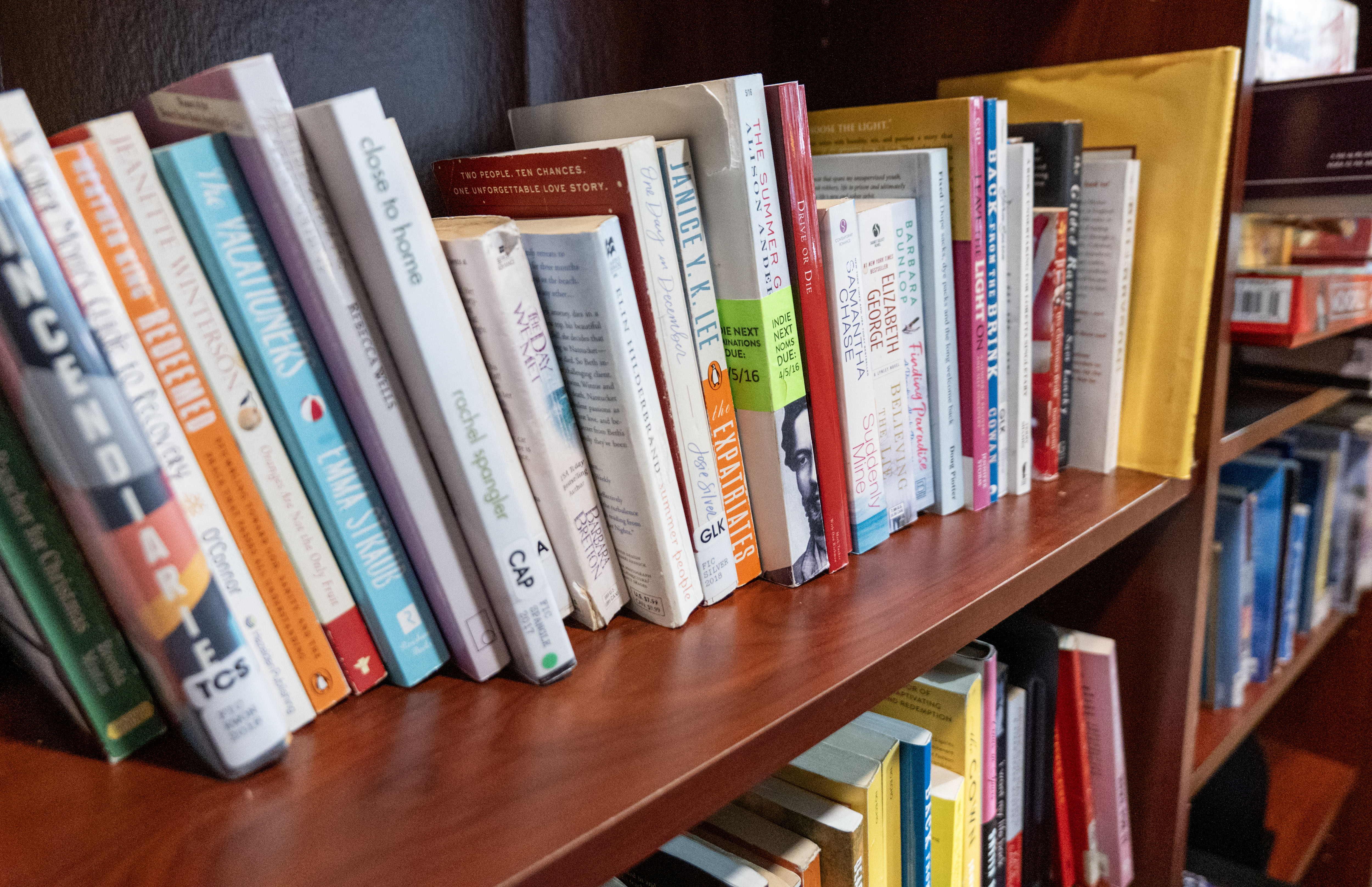 Close-up of a row of books on a shelf in a recovery support organization that visitors can borrow. Books include a range of titles from general fiction to books about recovery.