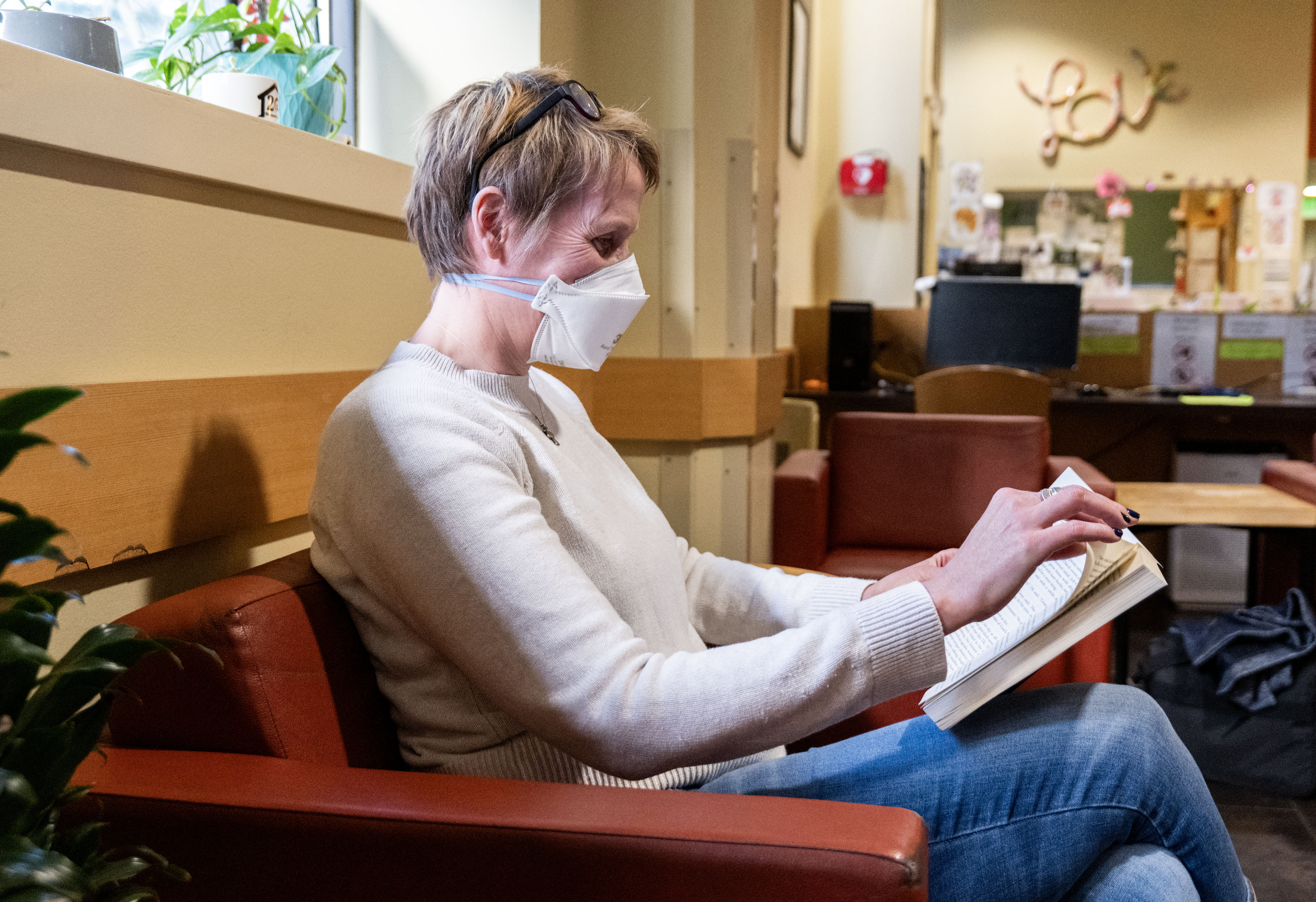 Click to download full-size image (5000 x 3428 pixels, 3MB) A recovery support organization visitor with short hair and an N95 mask sits in a red chair reading a book in a warmly lit community space. ID: RCSLU023 Location: Recovery Cafe South Lake Union Categories: Client patient Community Recovery support