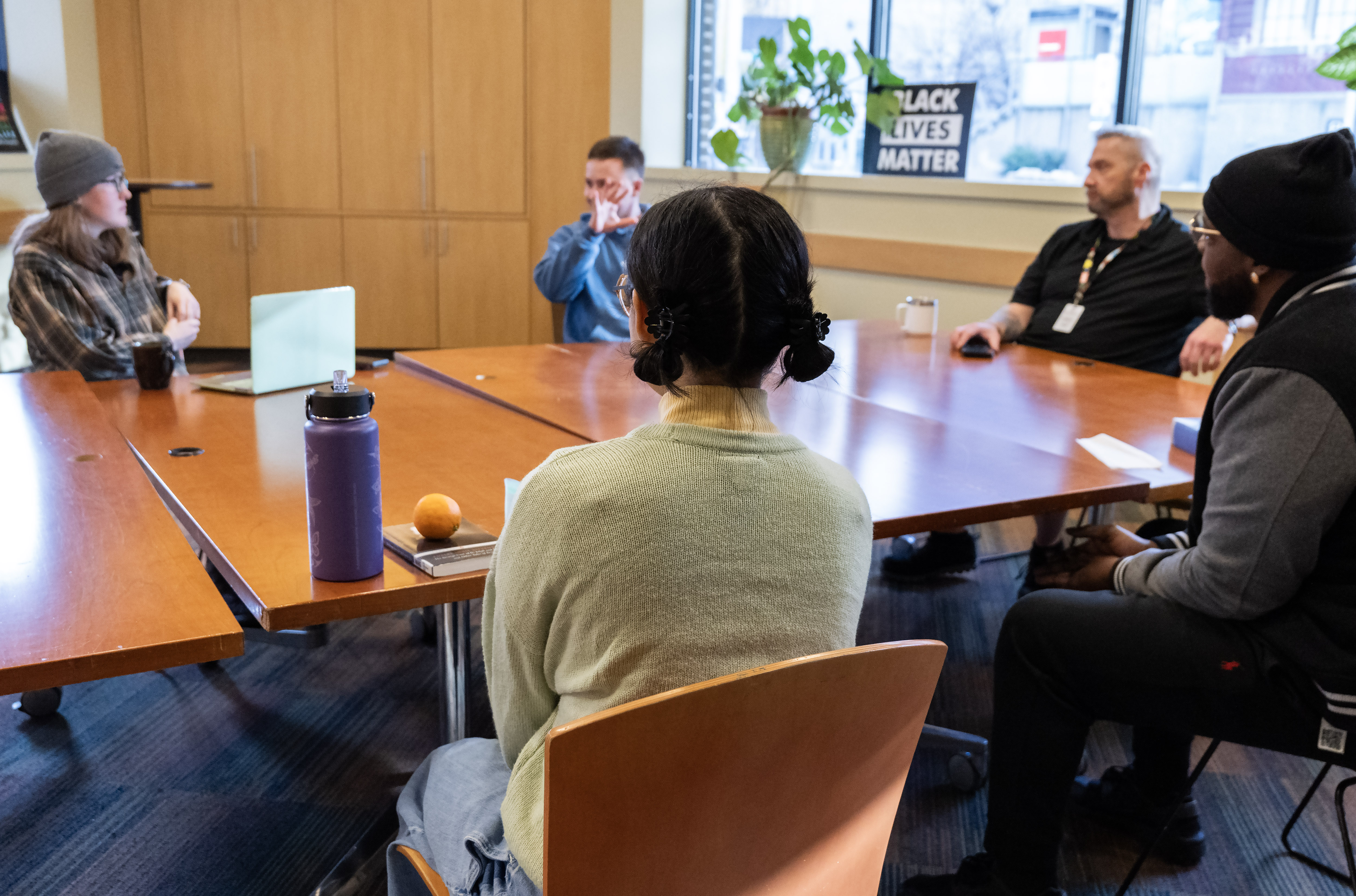 A group of five people seated at a large conference table (multiple tables pushed together) talking. The person at the head of the table is wearing a lanyard and badge. This image was taken at a community space for people in recovery but could be used for any type of group meeting, training, or class, including a twelve-step meeting.
