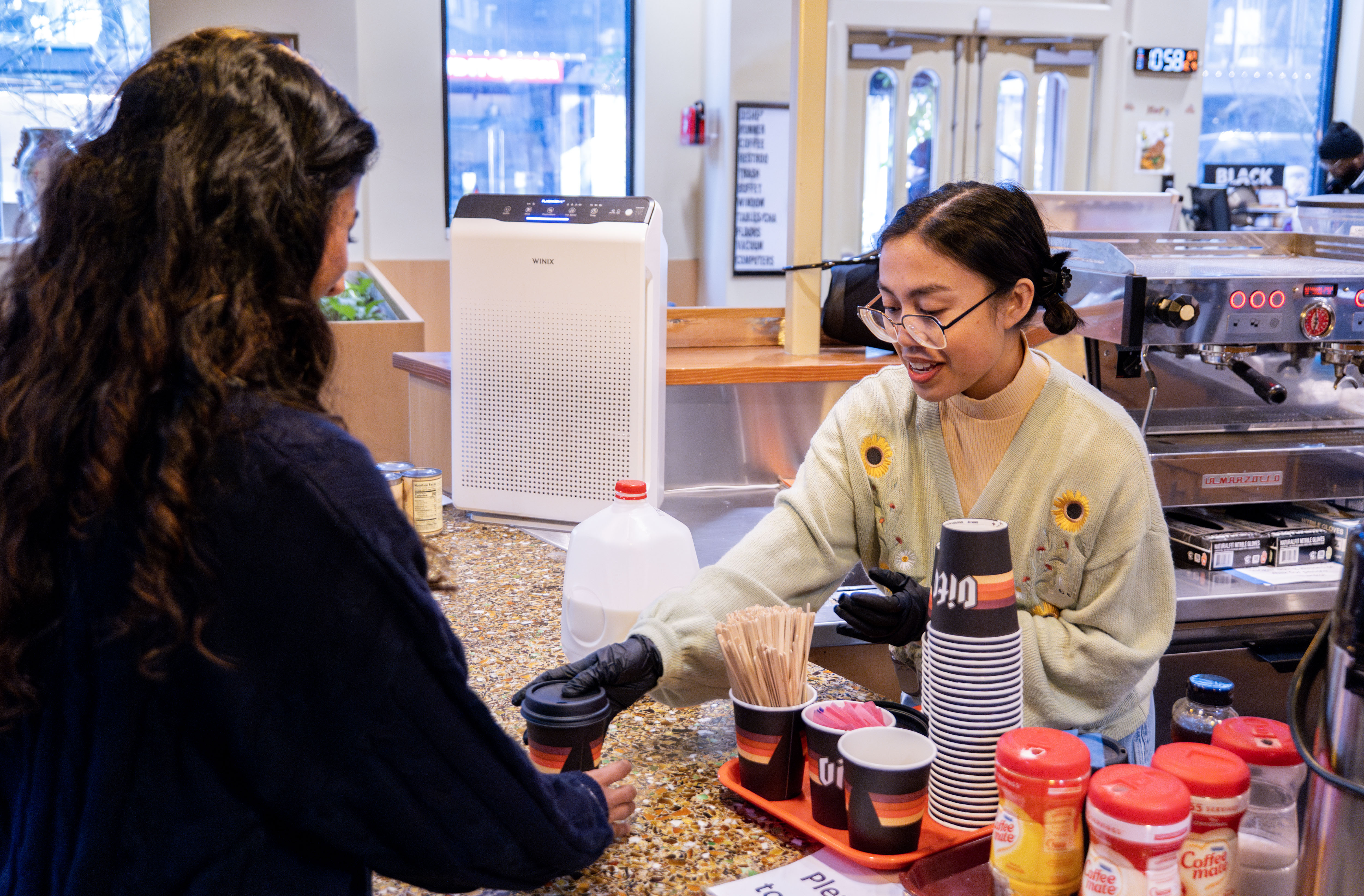 Click to download full-size image (5000 x 3286 pixels, 2.3MB) A recovery support organization cafe barista with dark hair and glasses hands a cup of coffee to a visitor. Behind them is an espresso machine. ID: RCSLU040 Location: Recovery Cafe South Lake Union Categories: Client patient Community Food assistance Interaction Provider staff Recovery support