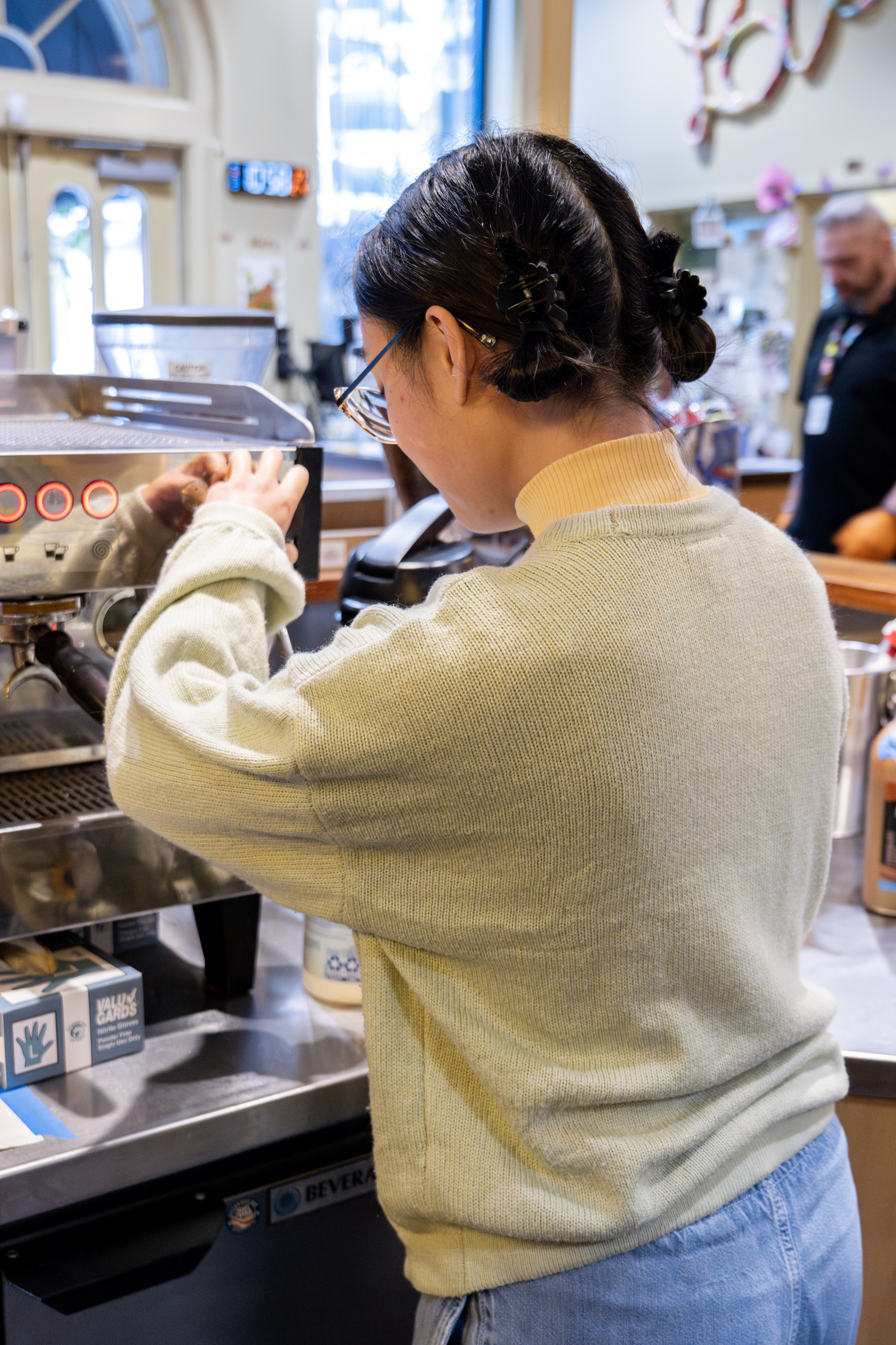 A recovery support organization cafe barista with dark hair pulled back and glasses uses an espresso machine to prepare a beverage for a visitor (not pictured).