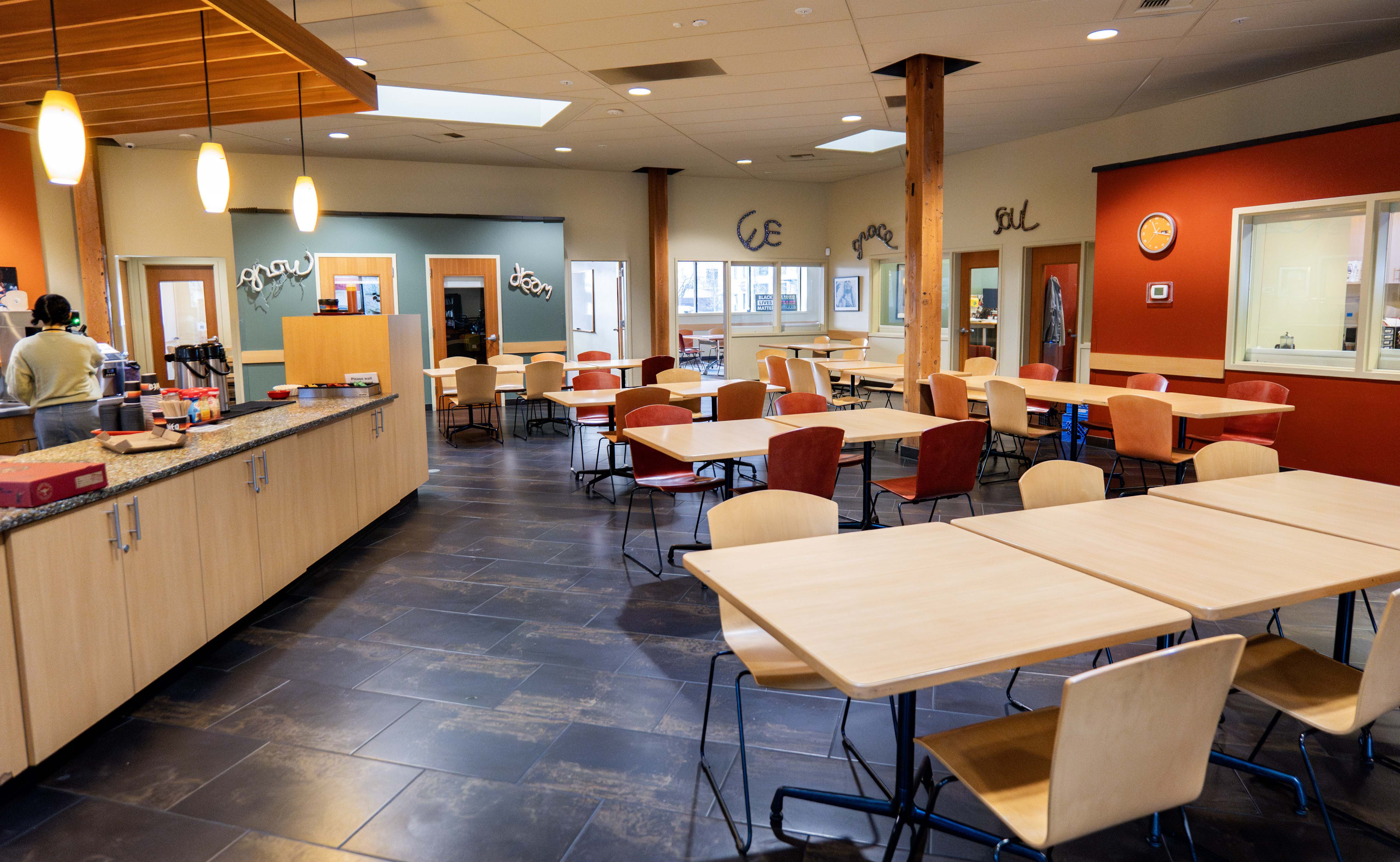 Warm, inviting community area of a recovery support organization with a cafe to the left, a number of tables and chairs, and warmly colored walls with classroom and meeting spaces around the sides and back. Artwork on the walls spells out words like “grow,” “dream,” “we,” “grace,” and “soul.”