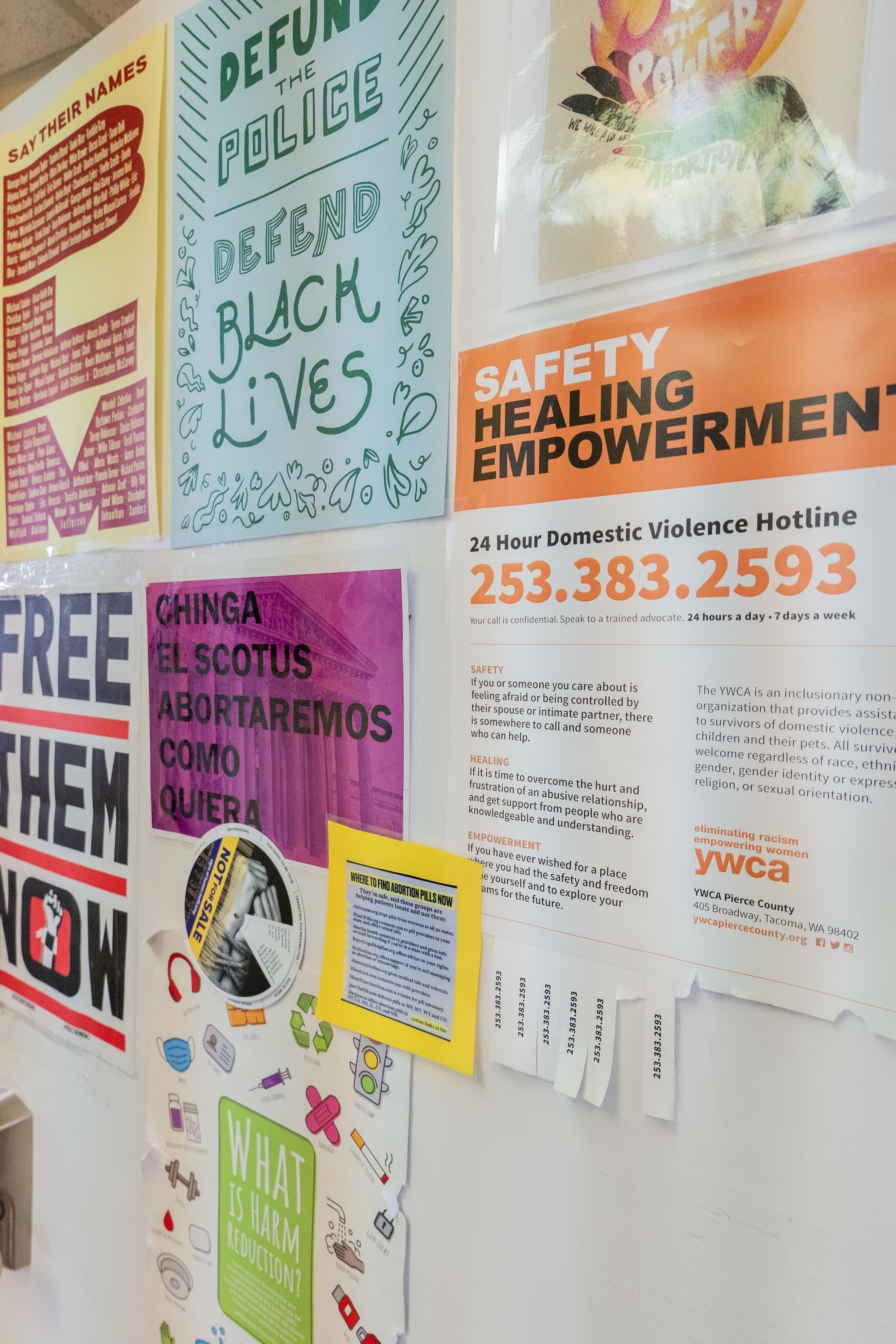 Bulletin board in a syringe services program showing multiple flyers related to community health and safety services, including a domestic violence hotline, a handout that reads “What is harm reduction?,” and a flyer that reads, “Defund the police, Defend Black lives.”