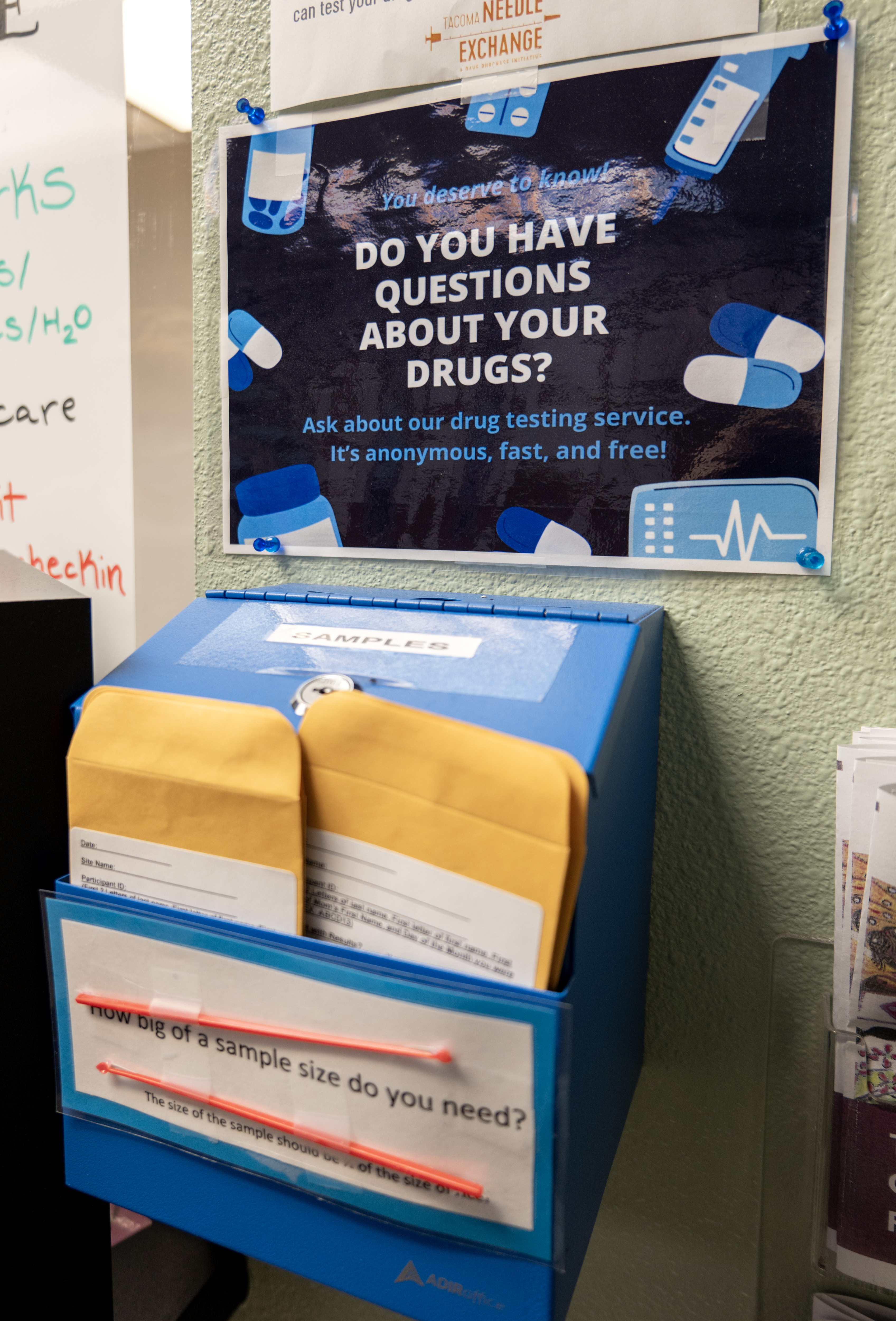 Photo taken at an angle of a blue drug checking sample drop box with envelopes and orange plastic spoons for taking different size samples and a sign that reads, “You deserve to know! Do you have questions about your drugs? Ask about our drug testing service. It’s anonymous, fast, and free!”