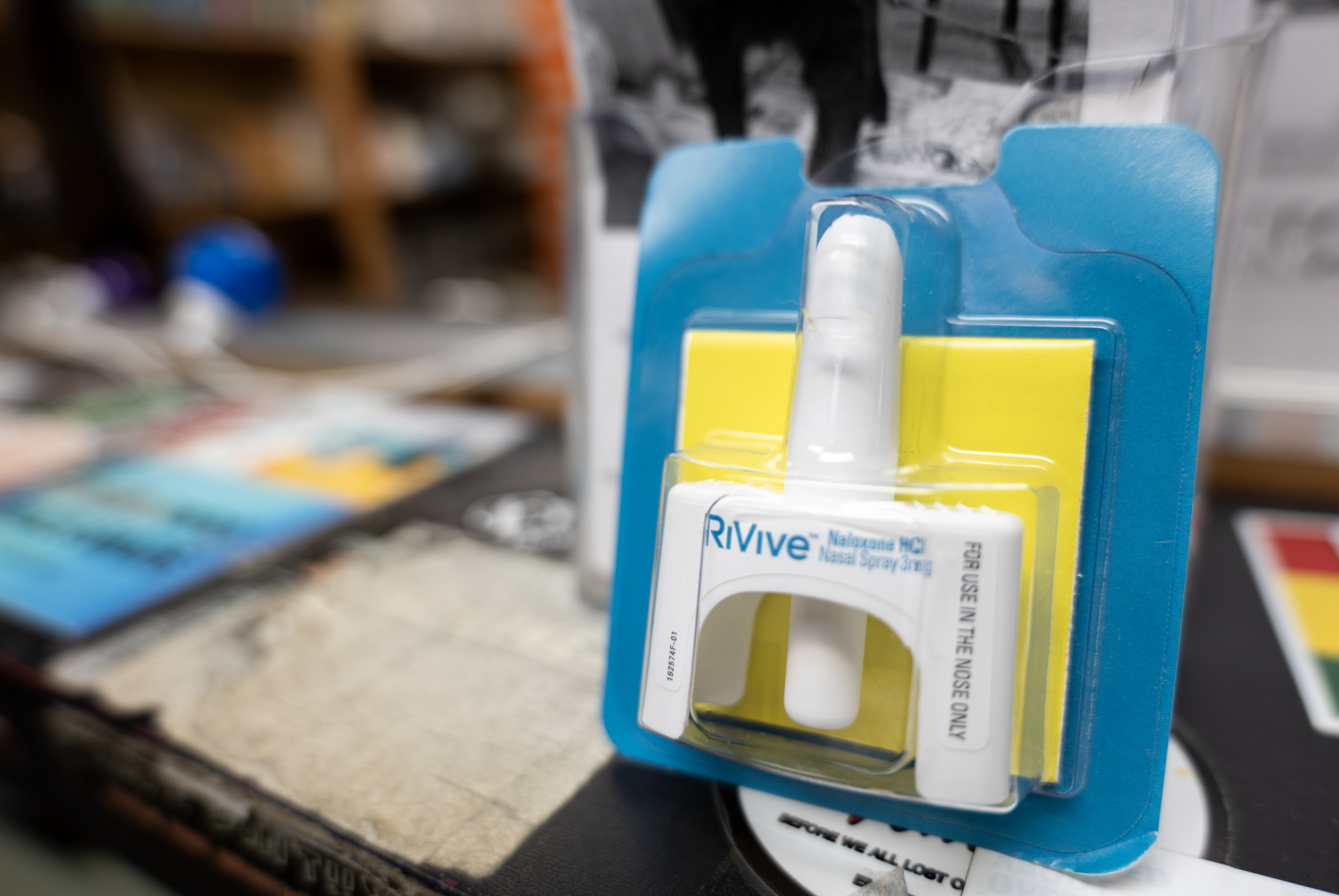 A single naloxone nasal spray atomizer in yellow and blue packaging sitting on a counter in a syringe services program that has some informational materials on it.