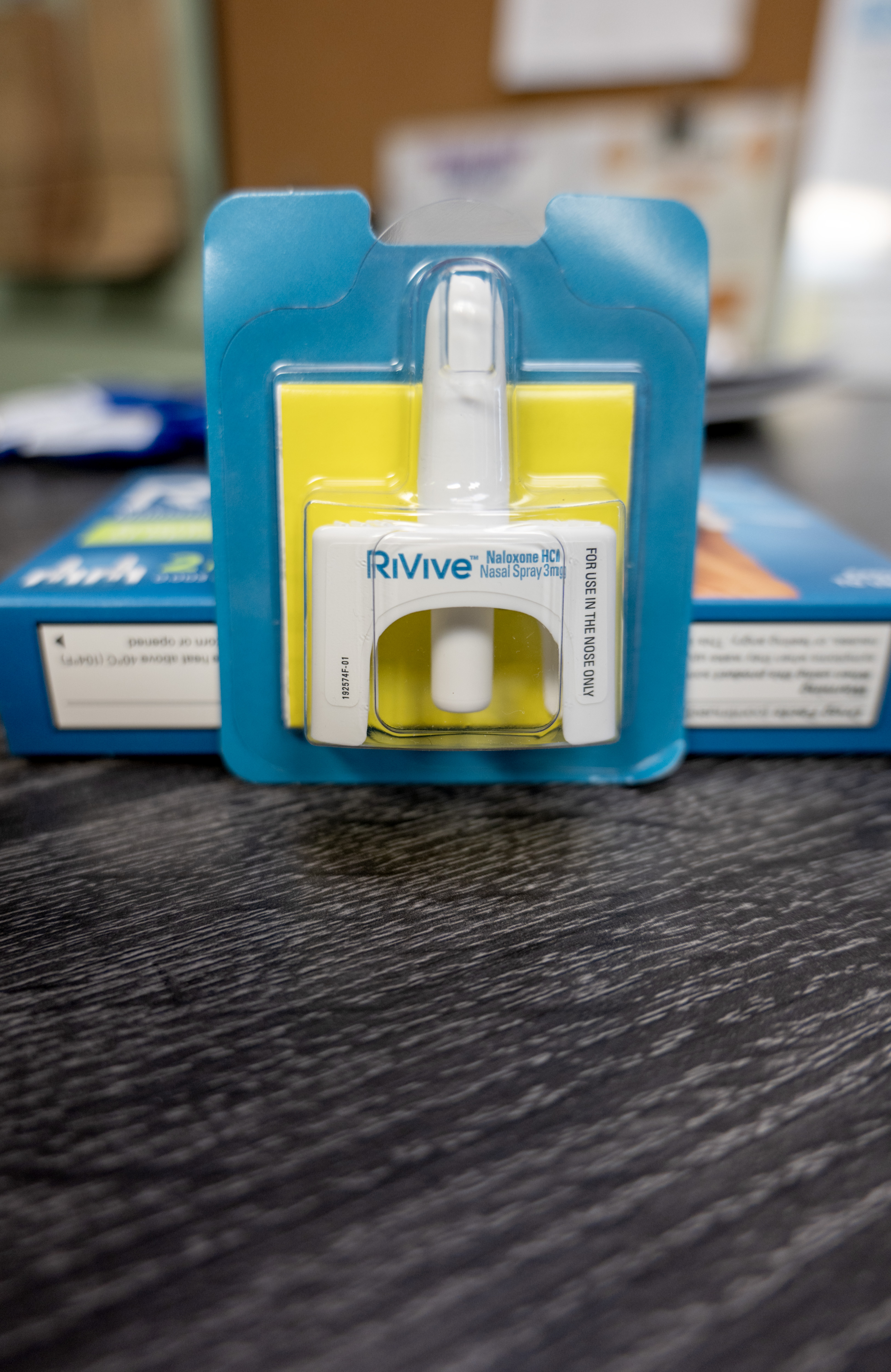 Click to download full-size image (3240 x 5000 pixels, 2.6MB) A single naloxone nasal spray atomizer in yellow and blue packaging sitting up against the box it came in on a wooden table. ID: TNE024 Location: Tacoma Needle Exchange Categories: Naloxone