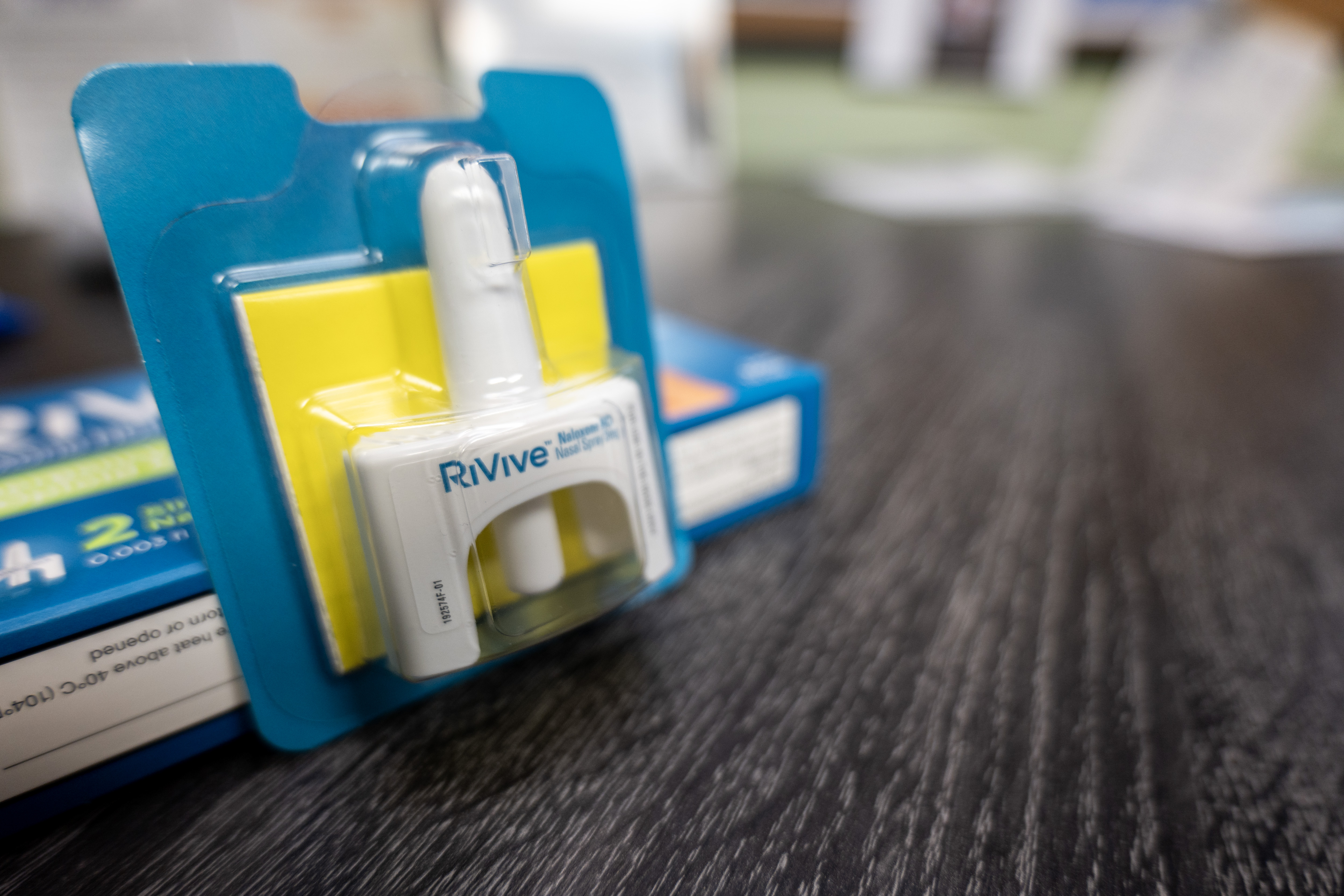 Click to download full-size image (5000 x 3333 pixels, 3.1MB) A single-use naloxone nasal spray atomizer in yellow and blue packaging sitting up against the box it came in on a wooden table. ID: TNE025 Location: Tacoma Needle Exchange Categories: Naloxone