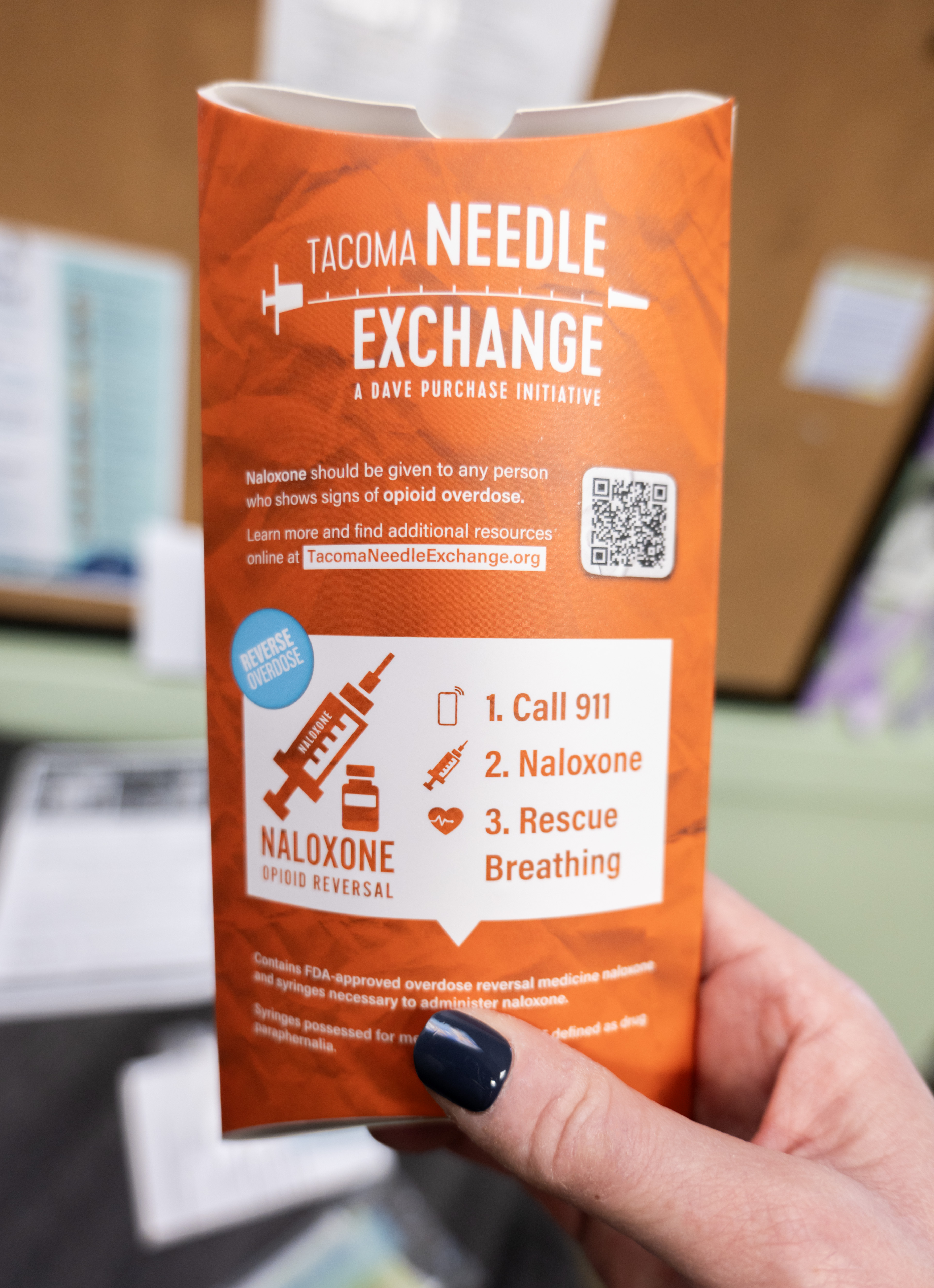 Close-up of a hand holding an intramuscular naloxone kit. The kit is in orange packaging with white lettering that reads, “Tacoma Needle Exchange: A Dave Purchase Project. Naloxone should be given to any person who shows signs of opioid overdose. Learn more and find additional resources online at TacomeNeedleExchange.org. Reverse overdose. Naloxone opioid reversal. 1. Call 911. 2. Naloxone. 3. Rescue breathing. Contains FDA-approved overdose reversal medication and syringes necessary to administer naloxone. Syringes possessed for medical use re NOT drug use paraphernalia.”