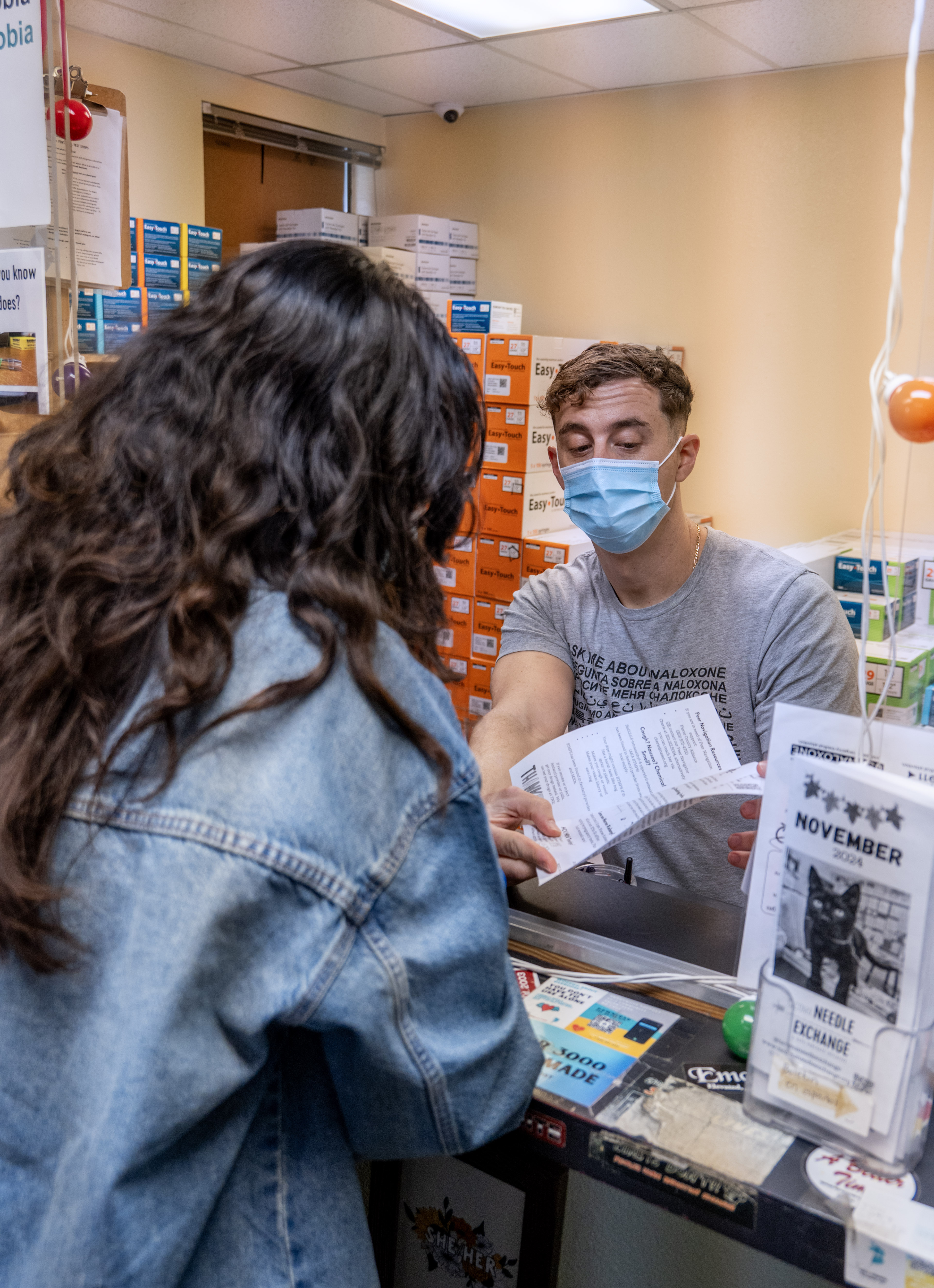 A window and counter at a syringe services program. Behind the counter is a staff person wearing a blue surgical mask and showing a pamphlet to a client with long dark hair and a blue shirt. He looks like he is explaining the information in the pamphlet as the client leans slightly forward, listening.