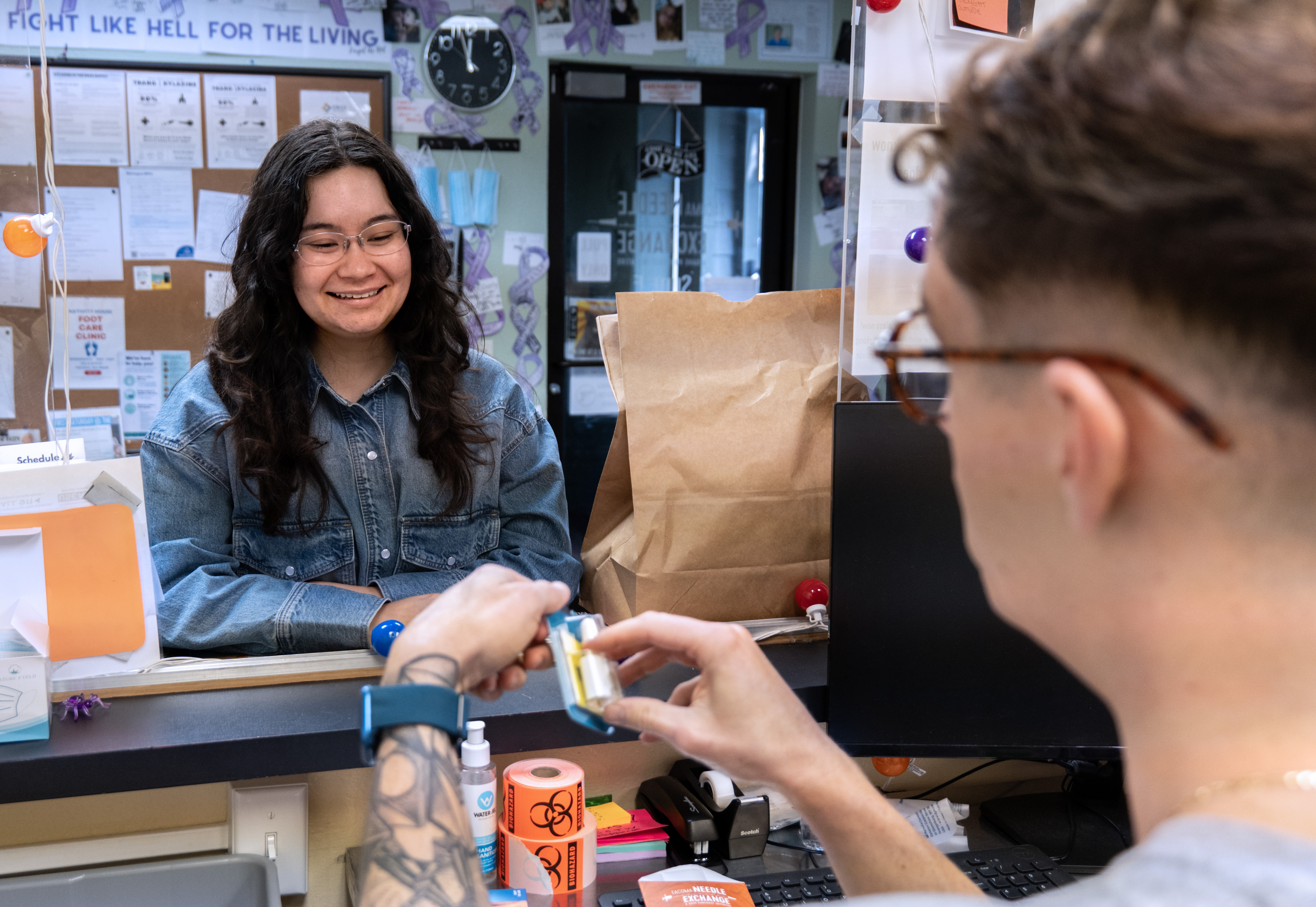 A smiling client at a syringe services program rests their arms on the counter as the staff person on the other side holds up a naloxone nasal spray device. Next to them is a large brown paper bag with safer use supplies in it.