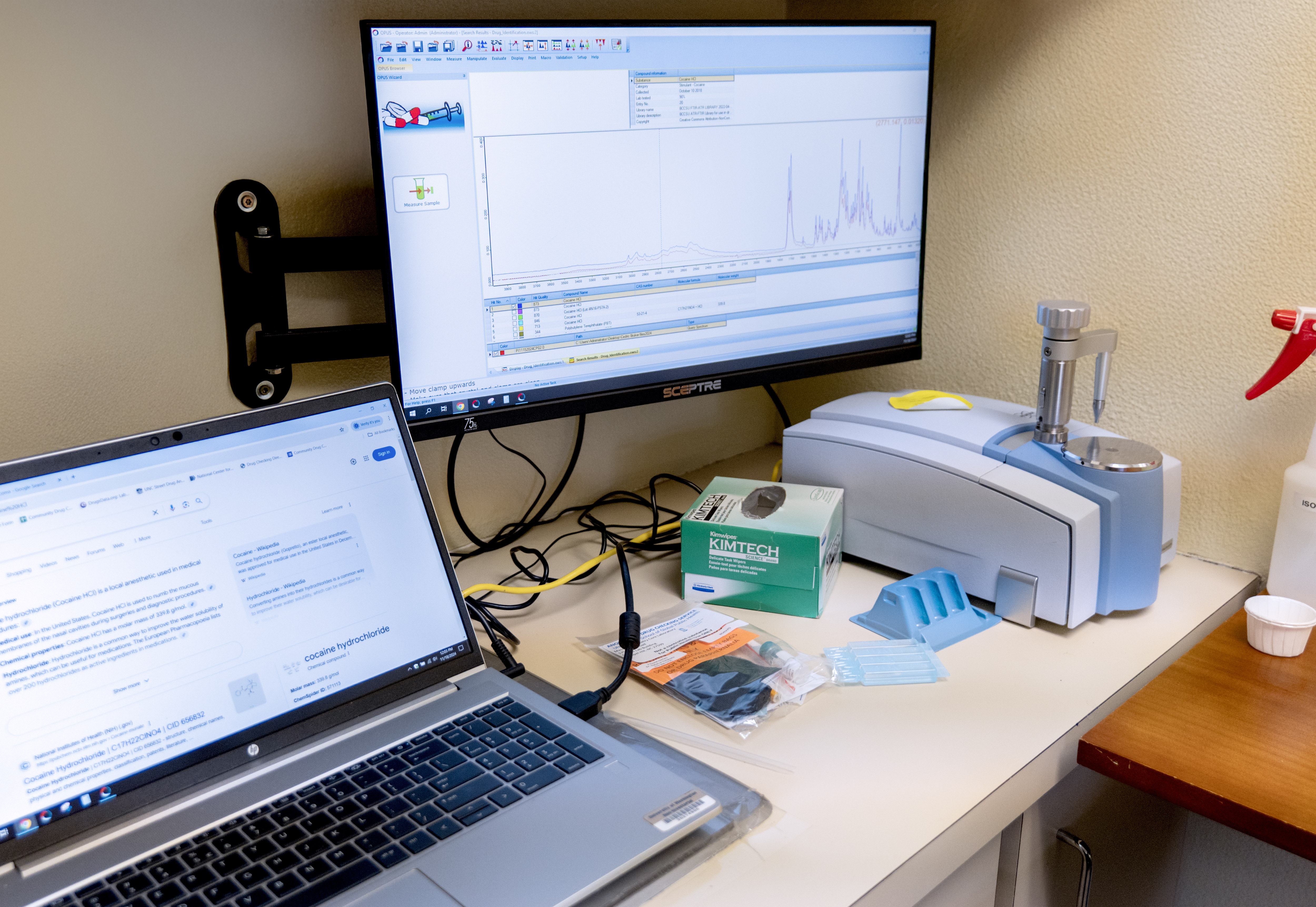 A desk with a laptop, a monitor mounted on the wall, and a compact FT-IR spectrometer use for drug checking. Also on the desk are some other items used for testing small samples for drugs, like a blue plastic stand for holding vials, some kimtech wipes, and some small containers of sterile water.
