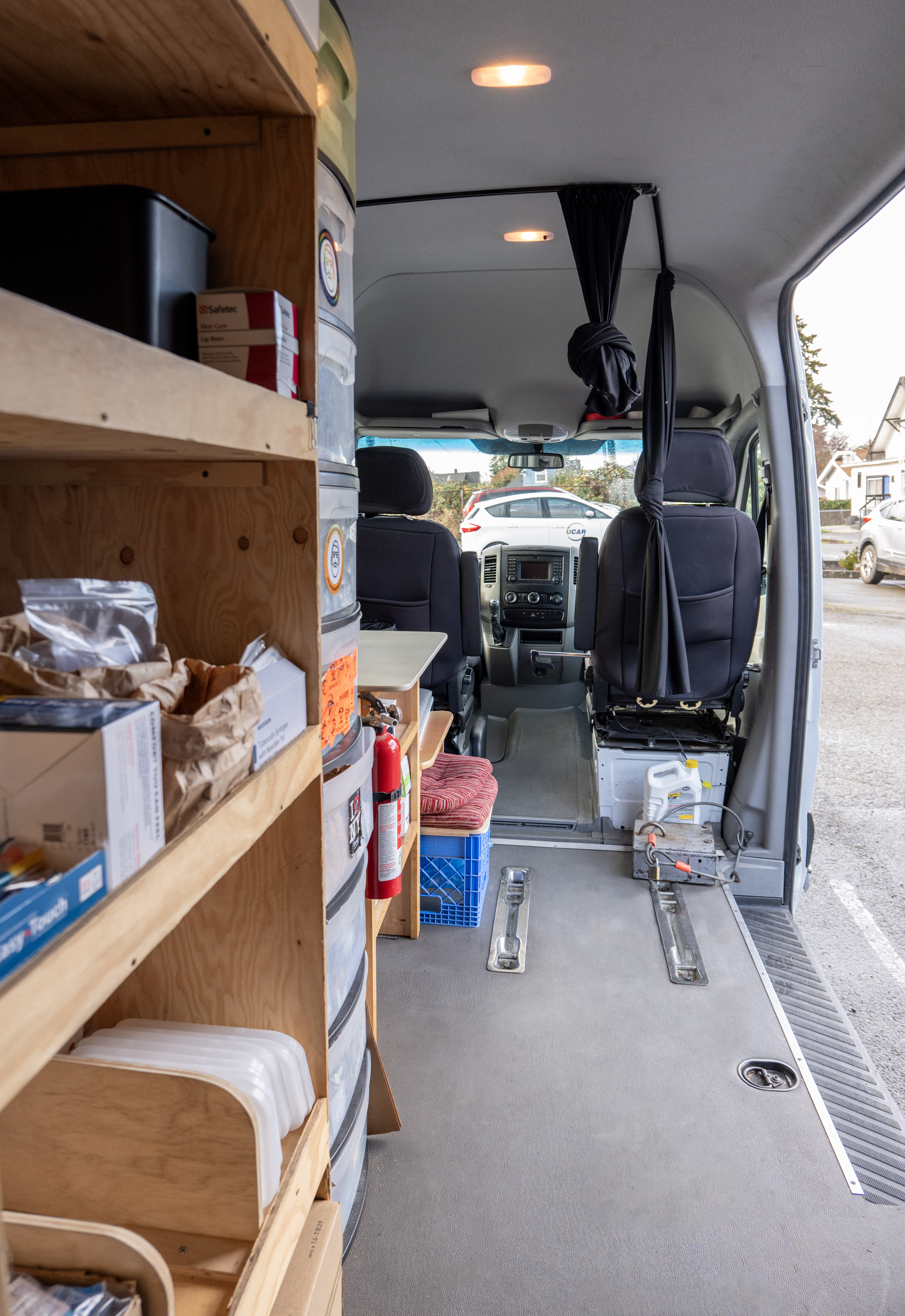 Image taken from the back of a syringe services program’s mobile services van toward the front showing the supply shelves, open side door, and driver and passenger seats.