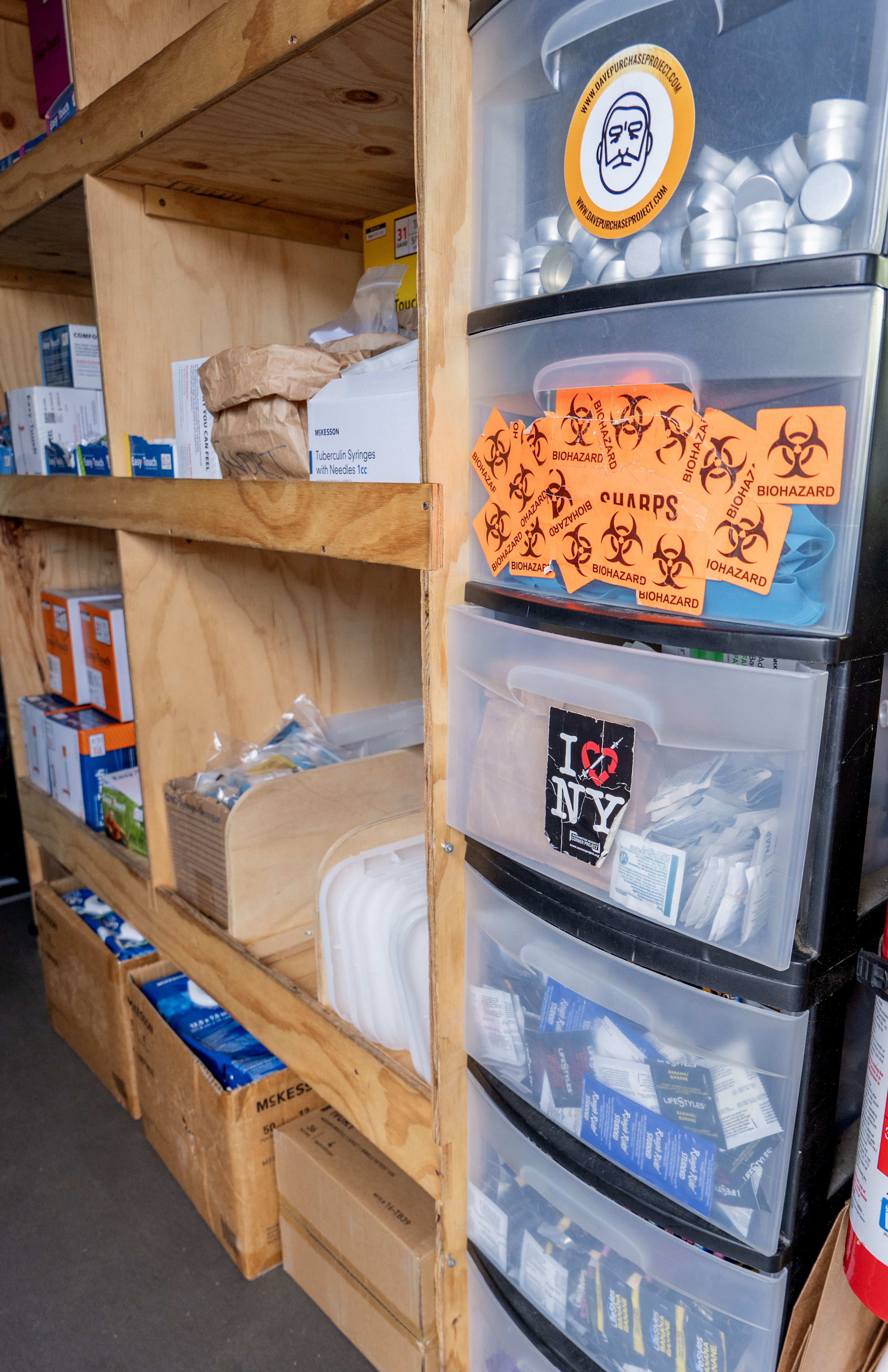 Click to download full-size image (3238 x 5000 pixels, 3.3MB) Close-up of row of shelves holding various safer use supplies in a syringe services program’s mobile services van. ID: TNE052 Categories: Mobile services Safer use supplies Syringe services program